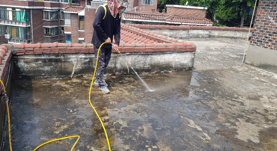 고압 호스를 이용한 물청소로 옥상의 먼지와 각종