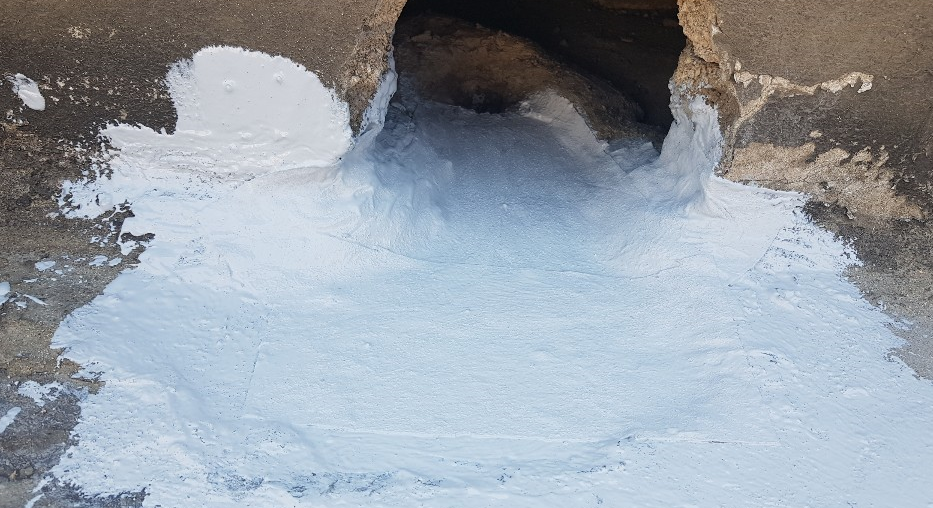 작업에 사용하는 방수액은 돌가루를 원료로 만든