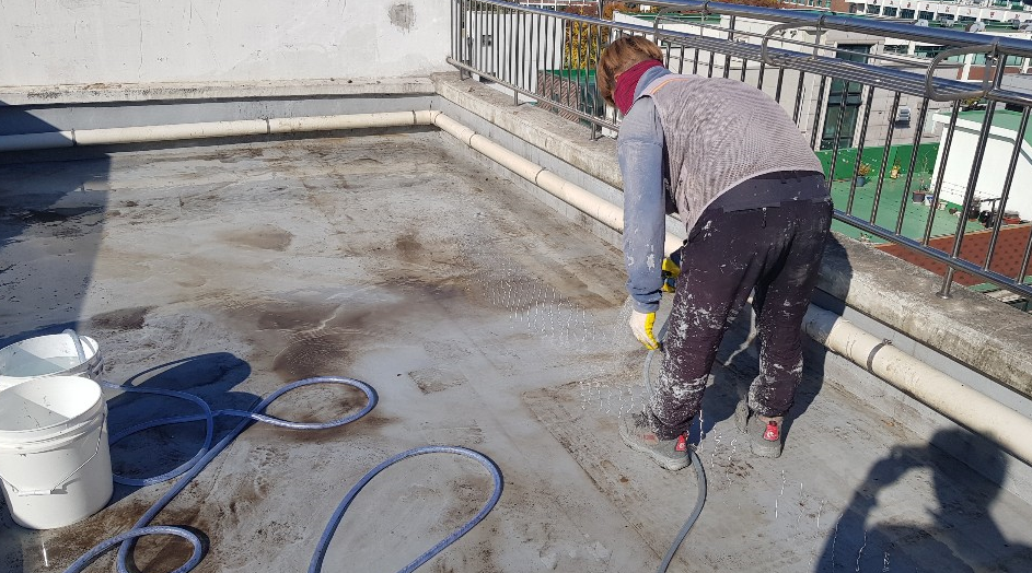 본격적인 바닥방수 작업에 앞서 바닥을 쓸고 닦는 바닥 정리와 함께 물청소 작업을 진행합니다. 바닥의 먼지와 이물질을 제거하지 않으면 앞으로의 작업이 효율적이지 않을 뿐더러 하자의 재발률도 크게 올라가게 됩니다.