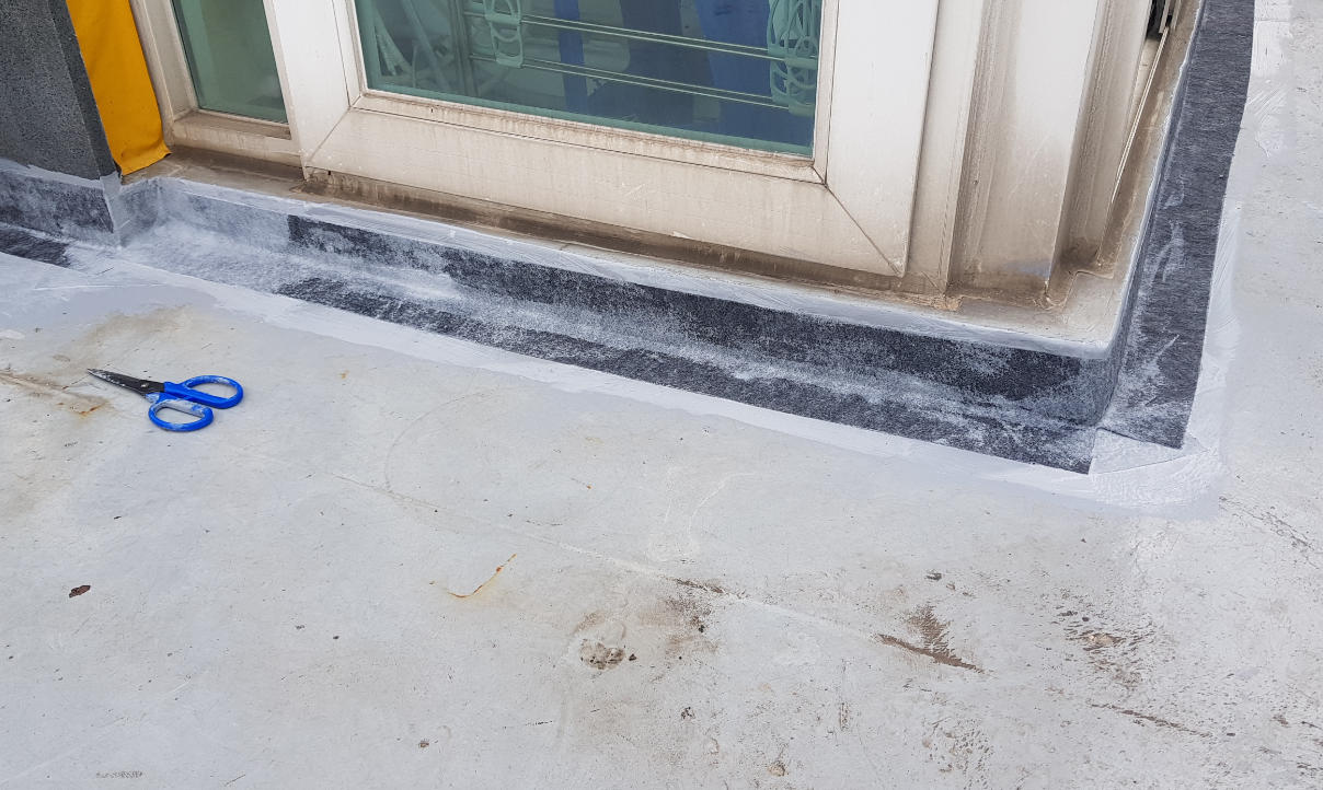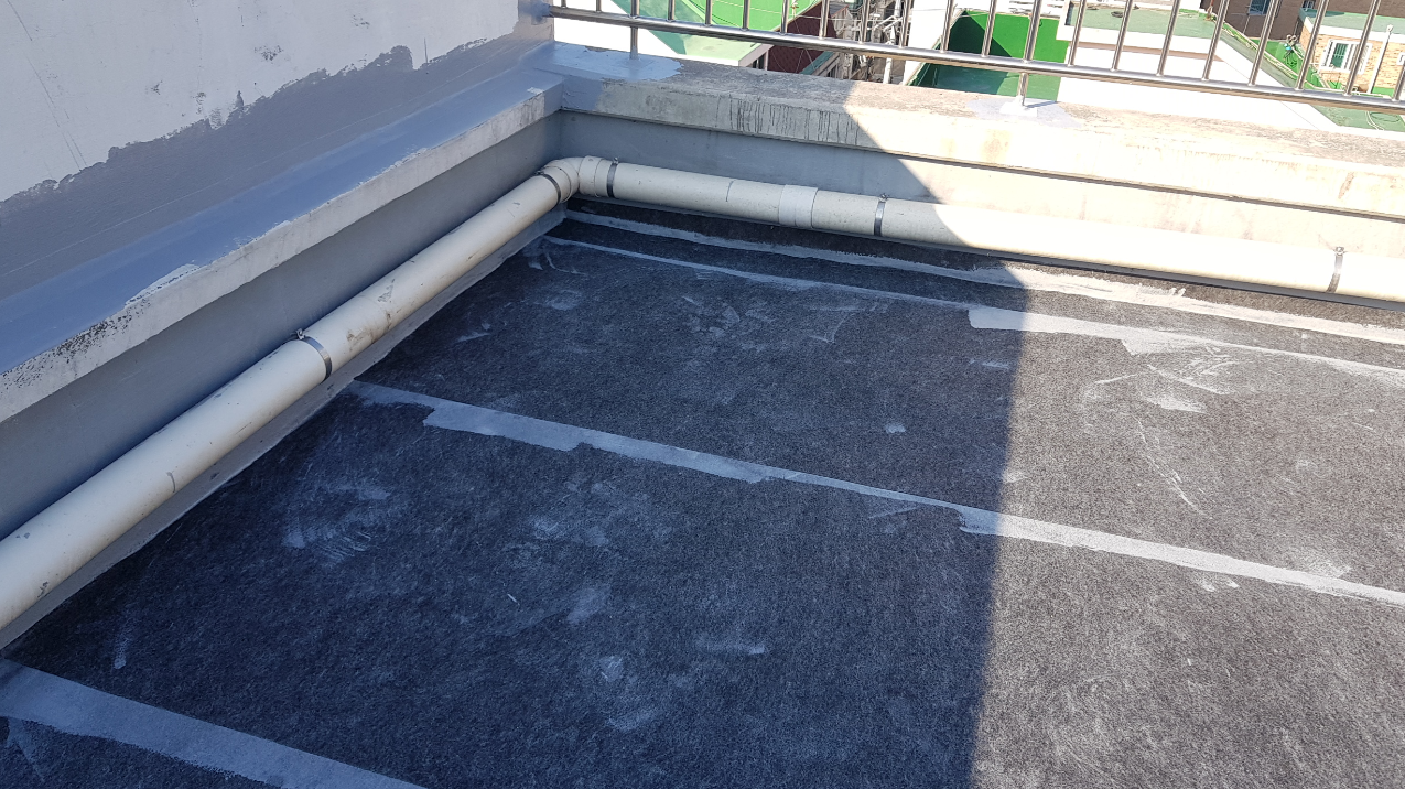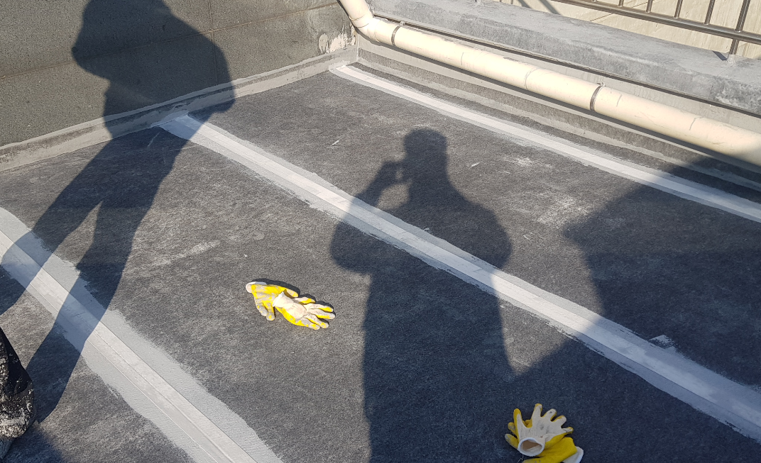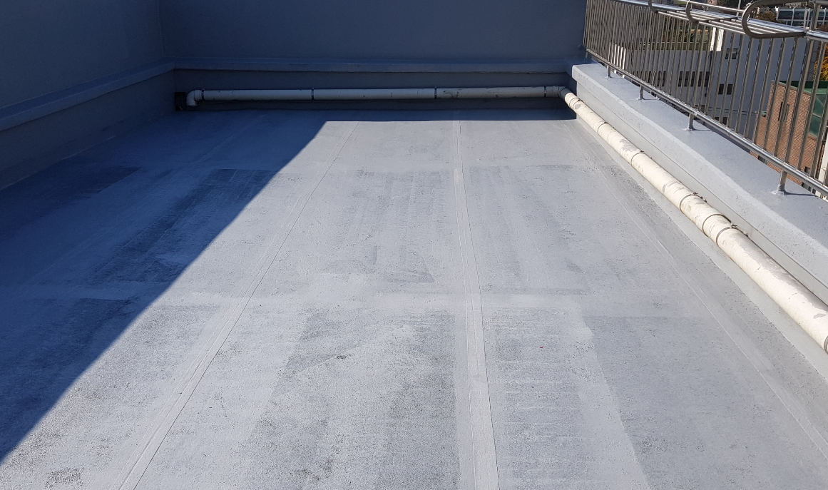옥상에는 누수에 특히 취약한 부분이 존재합니다. 물이 흘러내려가는 우수관(배수관)과 벽체의 조인트 부분 등이 이에 속하는데요. 이러한 취약점을 보강하기 위해 방수액과 방수 시트로 기초 시트 작업을 진행합니다.