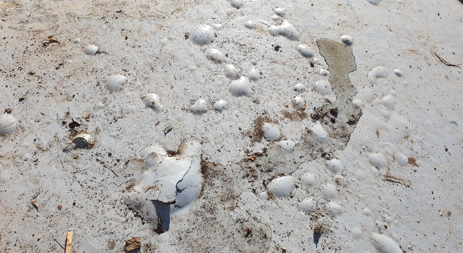 바닥을 더 자세히 살펴보면 부풀어 오른 부분도 있고 아예 벗겨져 맨바닥이 드러난 부분도 보입니다. 이렇게 하자가 발생한 부분을 통해 누수가 일어날 수 있습니다.