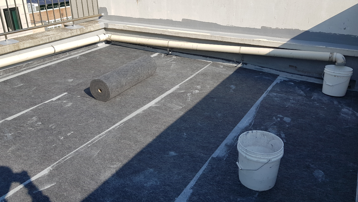 다음은 바닥 시트 작업입니다. 이 과정은 말 그대로 옥상 바닥에 방수 시트를 부착하는 작업으로, 방수액을 먼저 도포한 후 시트를 부착하는 방식으로 진행합니다. 작업에 사용하는 방수 시트는 신축성이 뛰어난 섬유 소재를 사용한 시트로 크랙을 잡는 데에 큰 장점이 있습니다. 또한 건물의 수축과 팽창에 잘 견디기 때문에 이로 인해 발생하는 갈라짐을 잘 막아줘 건물의 수명 연장에도 큰 도움을 줄 수 있습니다.