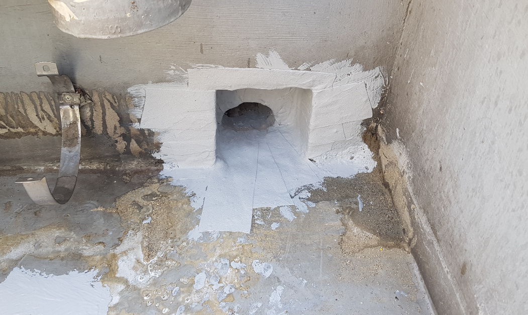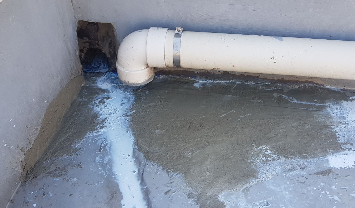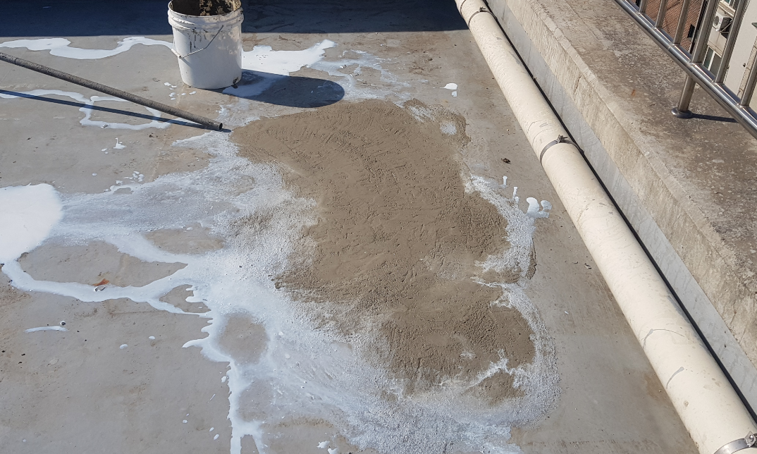 작업을 하다보면 바닥이 고르지 않은 부분이 있을 수 있습니다. 그런 부분에는 몰탈(시멘트)과 침투 방수액을 일정 비율로 섞어서 미장 작업을 진행합니다.