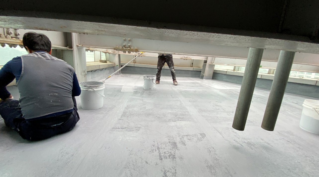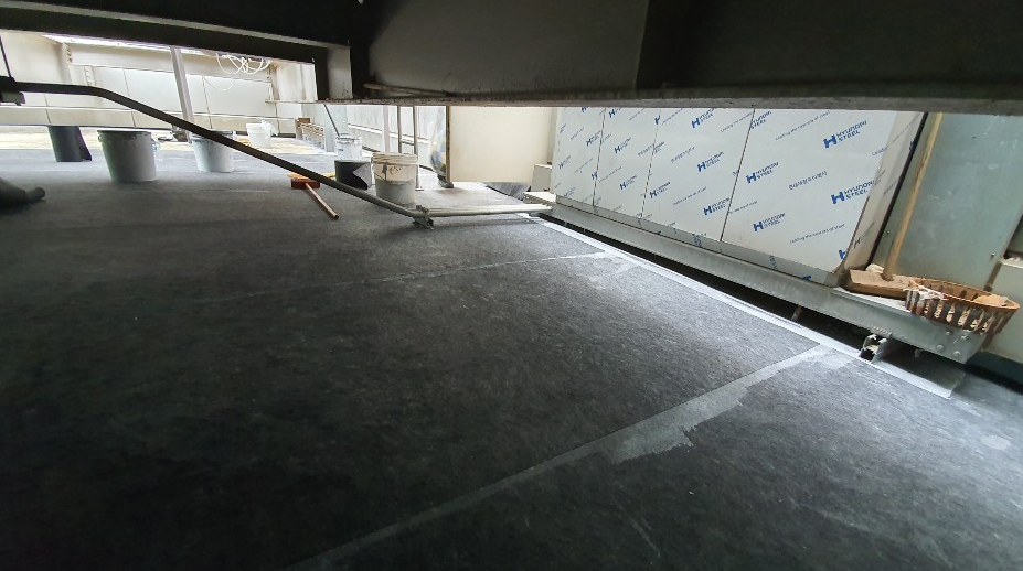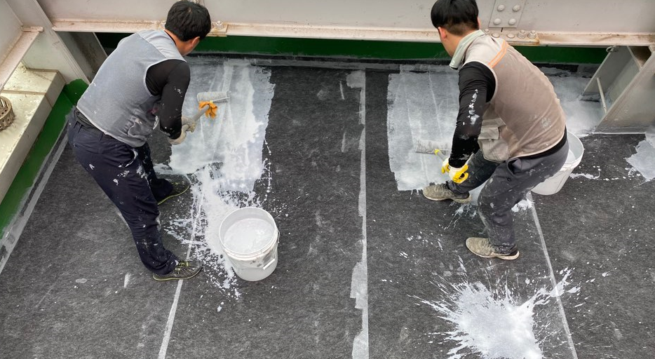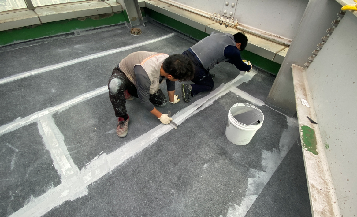 다음 작업은 바닥 시트 작업입니다. 옥상 바닥 전체에 방수 시트를 부착하는 작업으로, 방수액을 먼저 도포하고 그 위에 시트를 부착하는 방식으로 진행합니다.
