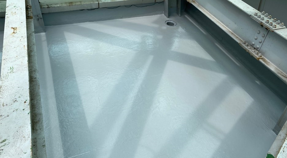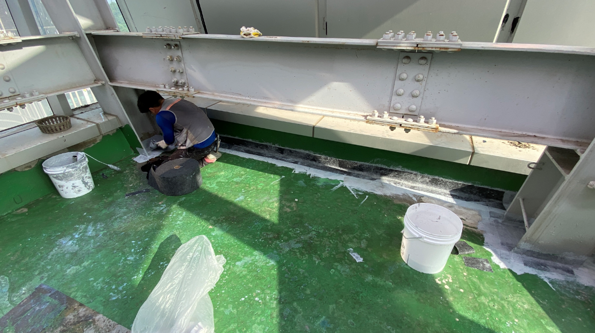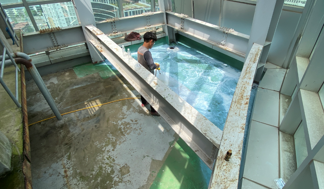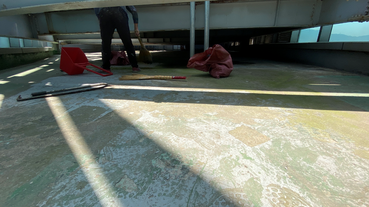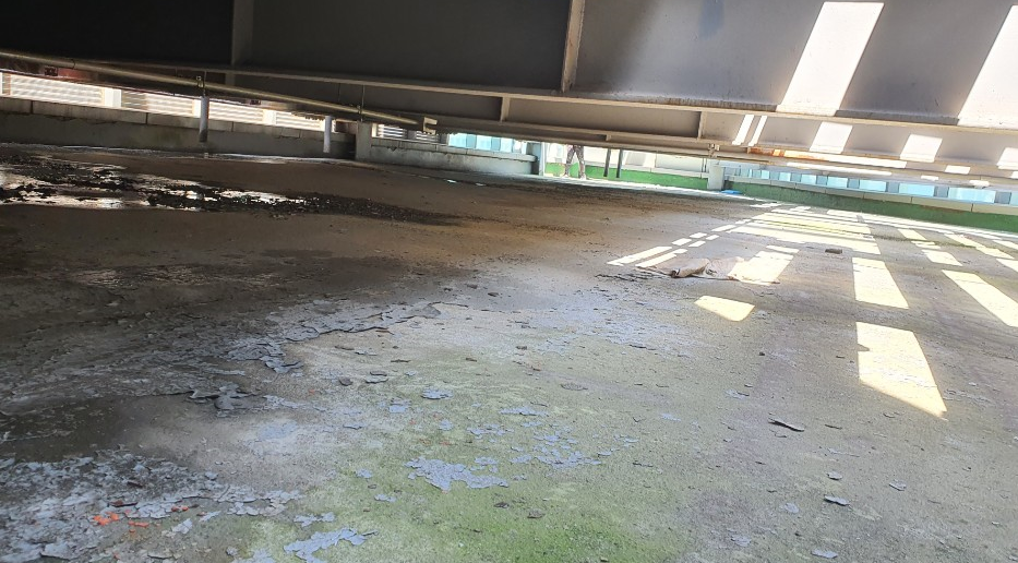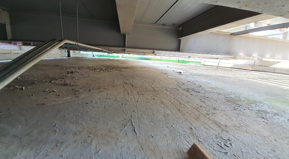 방수 작업을 시행하기 전의 현장 사진입니다. 잘 보이지는 않지만 기존에 초록색의 우레탄으로 작업된 옥상입니다. 보시다시피 구조물로 인해 위아래로 공간이 협소한 모습을 볼 수 있습니다.