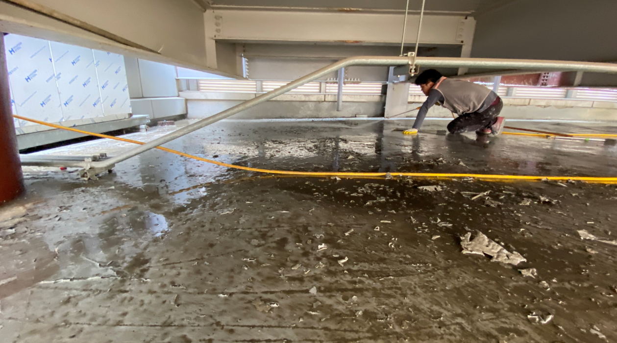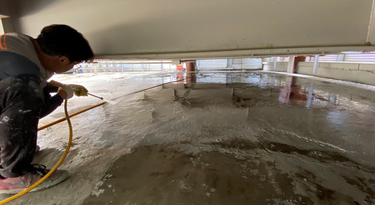 바닥을 어느 정도 쓸어냈다면 다음은 물청소를 진행합니다. 고압 호스를 이용하기 때문에 옥상의 먼지를 보다 깔끔하게 청소할 수 있습니다. 이렇게 작업 전 청소 과정을 거쳐야 하자 없이 완벽한 옥상이 완성됩니다.