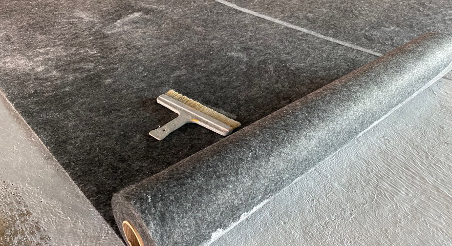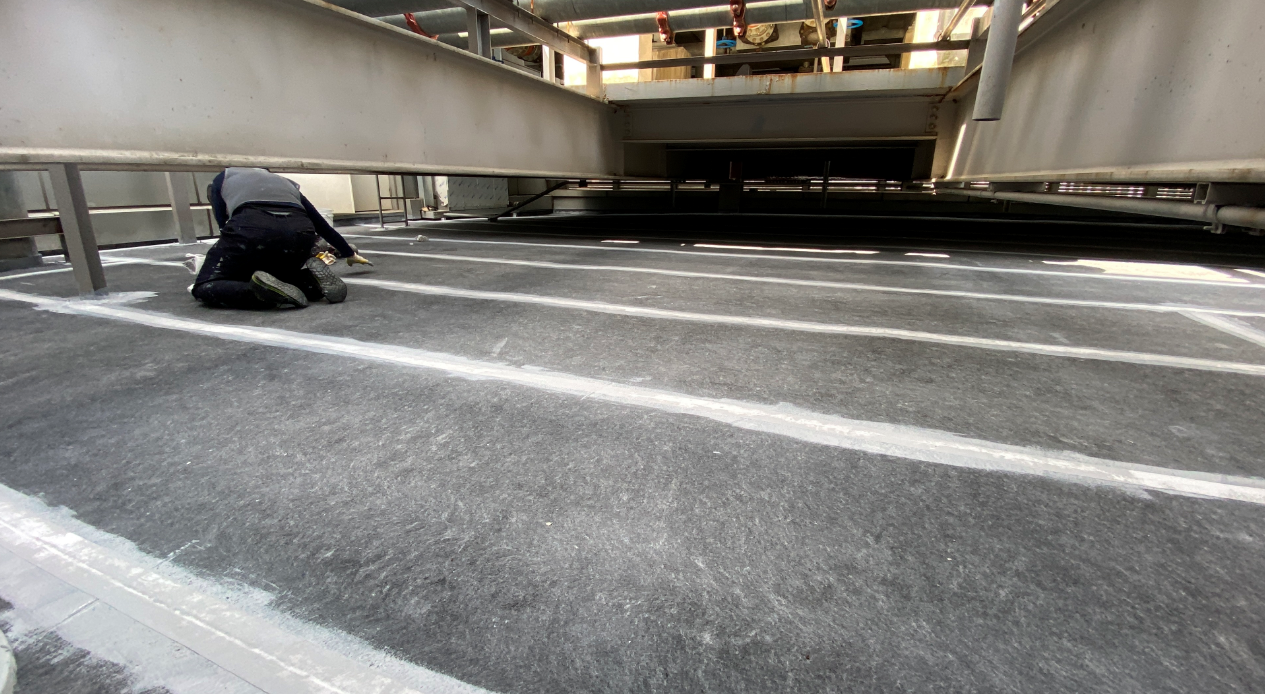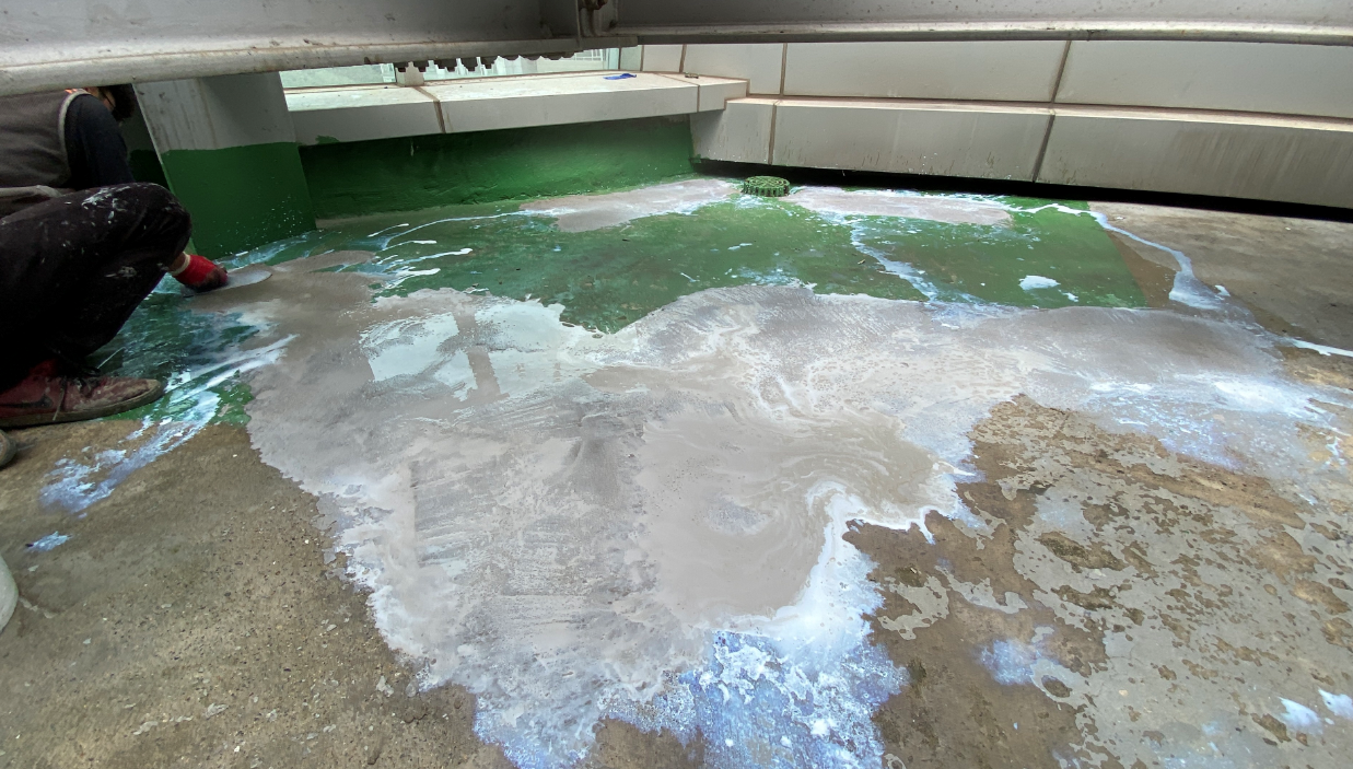 다음으로 진행하는 함침 작업은 방수 시트 위에 침투 방수액을 도포하는 과정입니다. 함침은 시트와 바닥을 일체화시키는 과정으로 서로 떨어져 하자가 발생하지 않도록 하는 역할을 합니다.