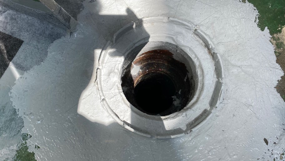 물이 자주 새는 벽체의 조인트 부분이나, 우수관(배수관)에는 기초 시트 작업을 진행합니다. 방수액과 방수 시트로 작업하여 누수에 취약한 부분을 보완하는 과정입니다.
