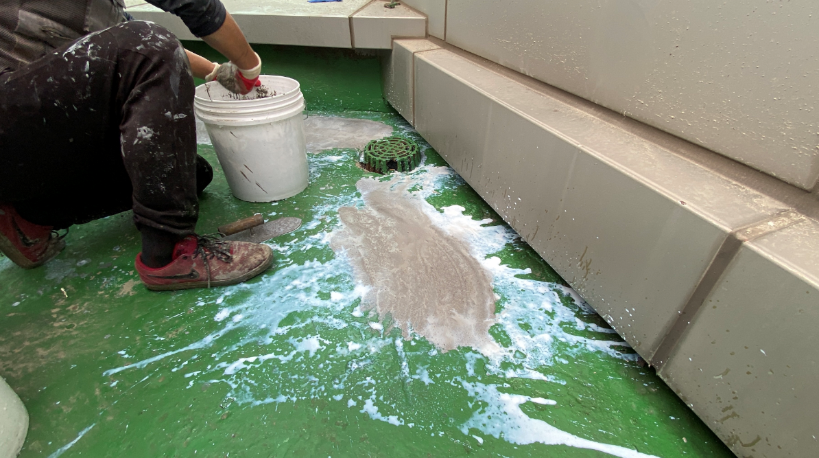 옥상 바닥에 하자로 인해 패인 부분이나 단차가 있다면 미장을 해서 평평하게 만들어야 합니다. 미장은 몰탈(시멘트)과 침투 방수액을 일정 비율로 혼합하여 작업합니다.