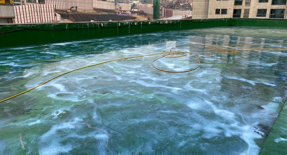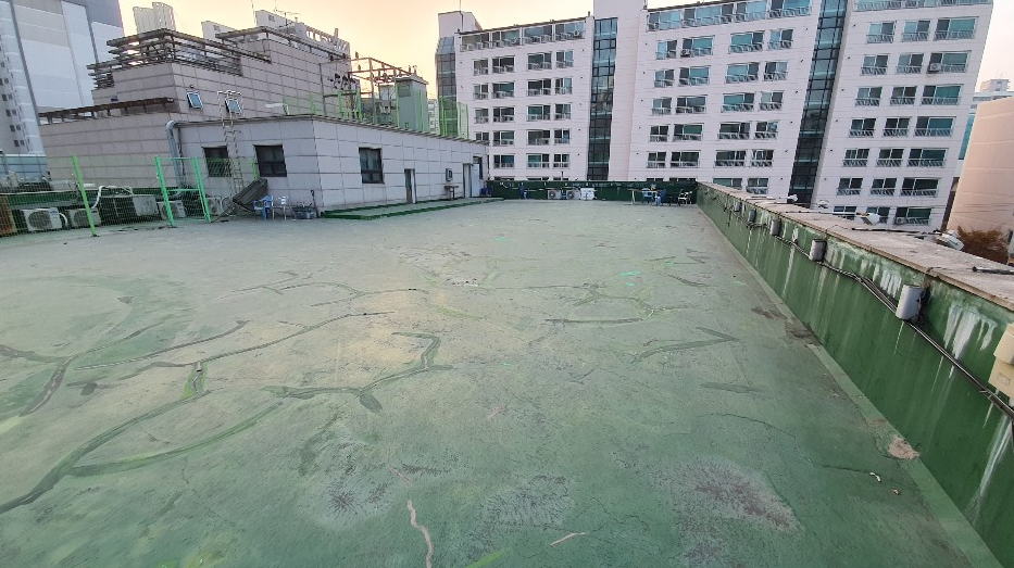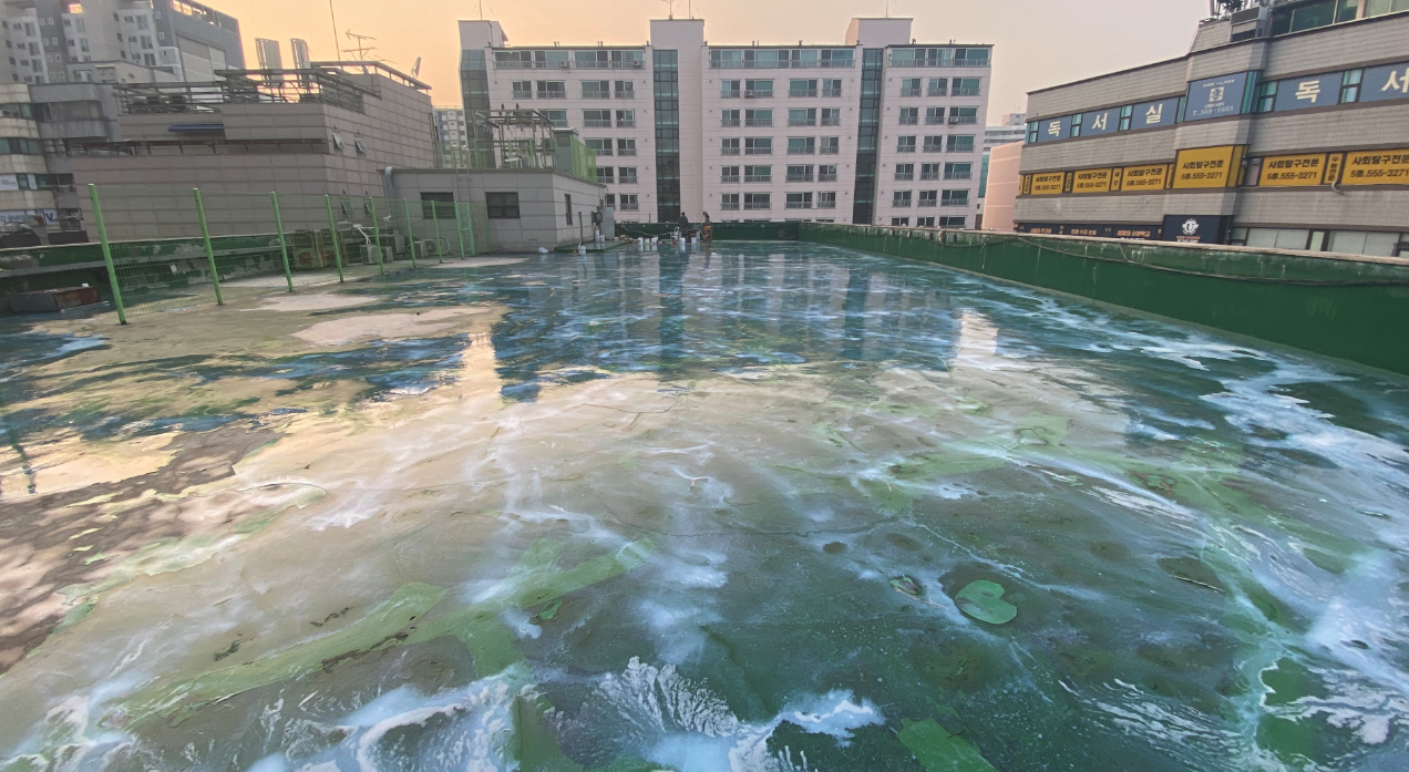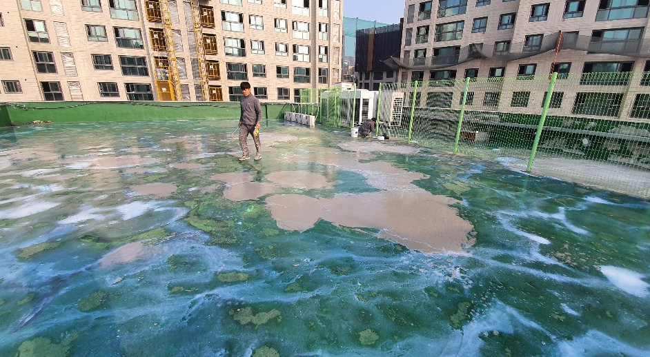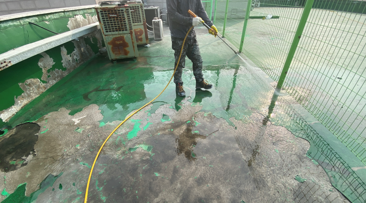 다음은 물청소 작업입니다. 옥상의 먼지와 이물질을 제거하기 위한 작업으로 고압 호스를 사용하기 때문에 묵은 때까지 깔끔하게 없앨 수 있습니다.