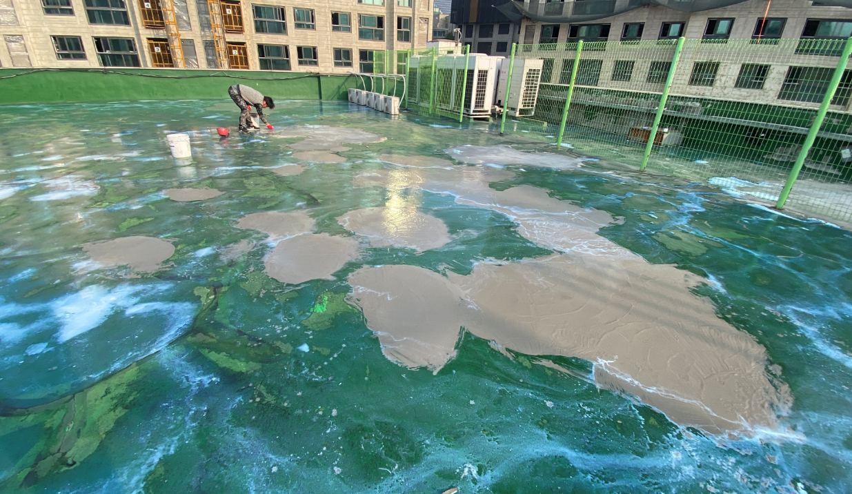 바닥에 1차적으로 침투 방수의 효과를 주면 더욱 효율이 좋기 때문에 프라이머 작업을 진행합니다. 침투 방수액을 옥상 전체에 도포하는 작업으로 침투 방수의 효과와 함께 바닥에 남은 먼지와 이물질을 흡착하여 제거하는 역할을 합니다.