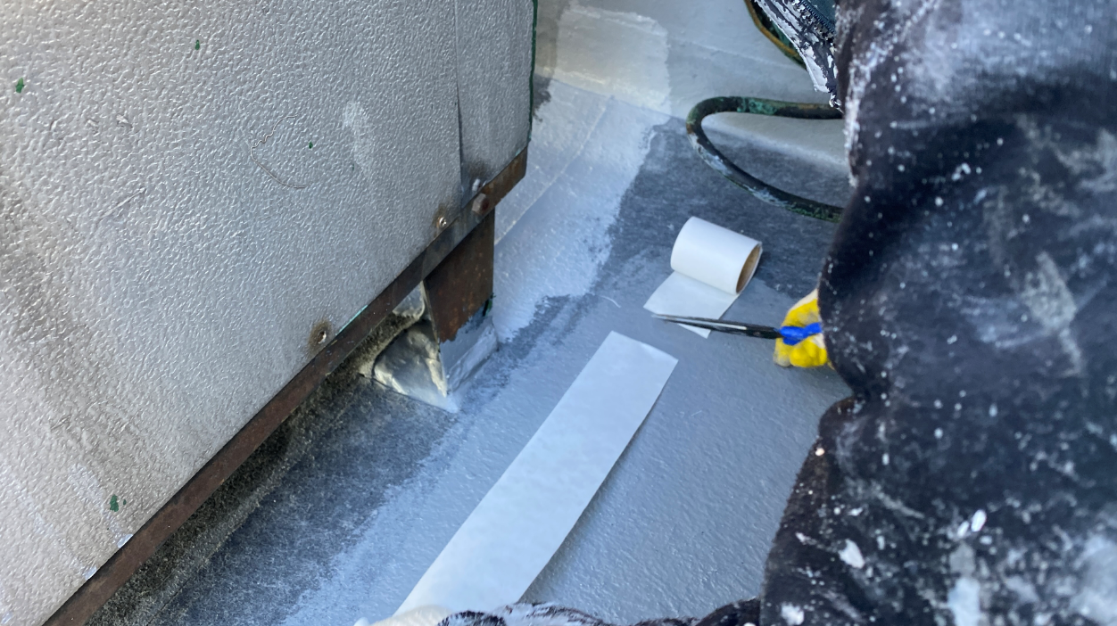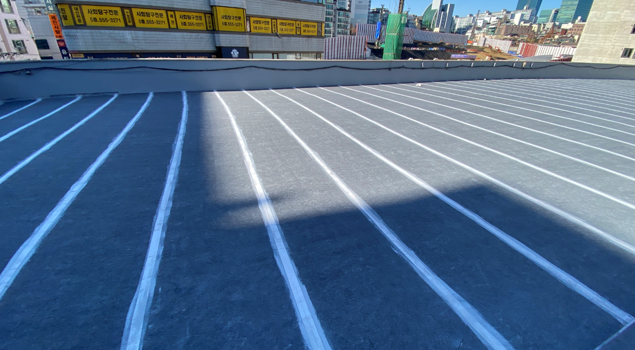 바닥 시트 작업은 옥상 바닥 전체에 방수 시트를 부착하는 작업입니다. 작업에 사용하는 시트는 신축성이 좋기 때문에 크랙을 단단하게 잡아주고, 건물의 수축과 팽창에 잘 견뎌 수명이 오래가도록 도와줍니다.