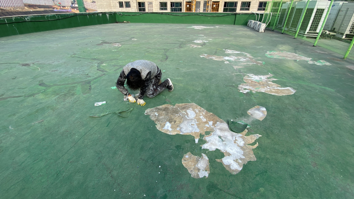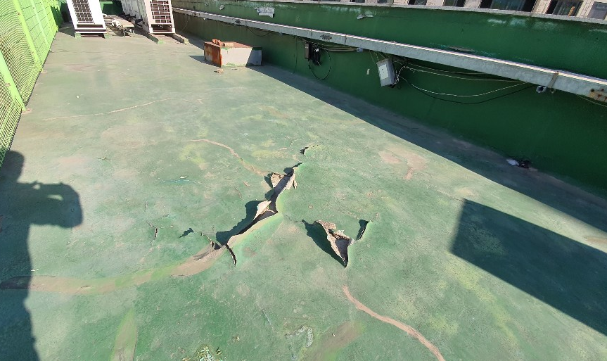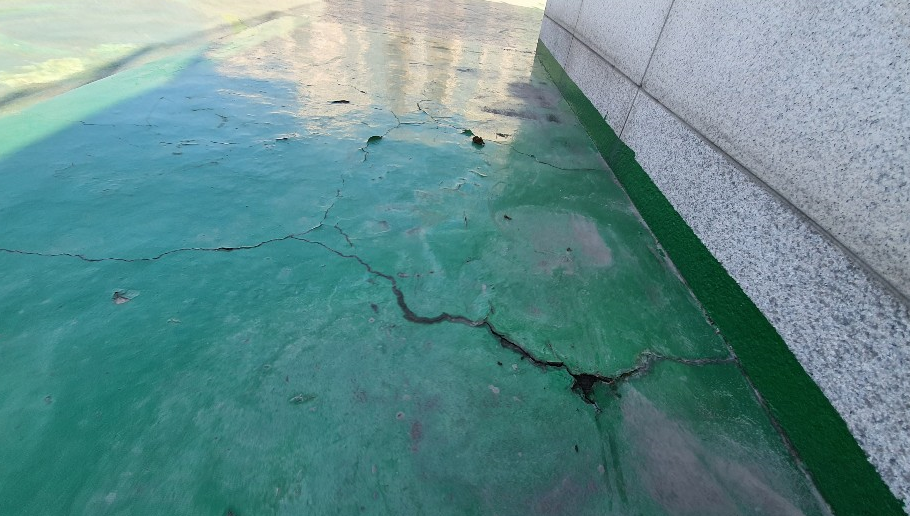 기존에 우레탄으로 작업한 옥상에 하자가 발생했습니다. 갈라진 바닥을 막아보려 우레탄으로 덧칠을 한 흔적을 볼 수 있습니다. 하지만 얼마 못 가서 다시 터져버리고 말았습니다.