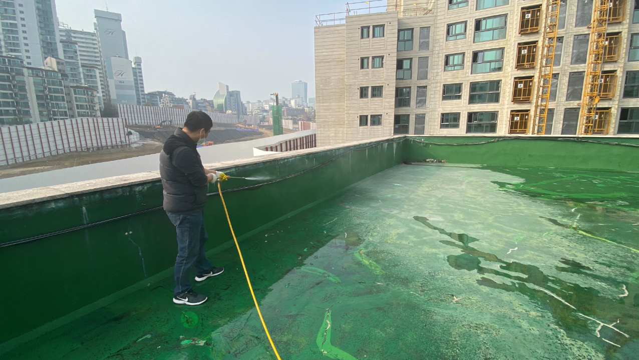 다음은 방수액 도포 작업입니다. 방수액은 총 3차례에 걸쳐 도포하는데, 앞선 과정에 더해 총 7겹의 방수층을 형성합니다. 때문에 하도, 중도, 상도의 3단계로만 끝나는 우레탄 방수보다 방수력이 탁월하며 오래갑니다.