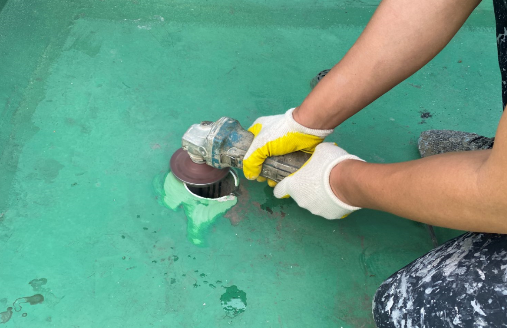 본격적인 시공에 들어가기에 앞서 바닥을 깔끔하게 정리합니다. 하자가 있는 부분은 가능한 곳까지 최대한 제거하고, 튀어나와 작업에 방해가 되는 부분은 그라인더를 이용합니다.