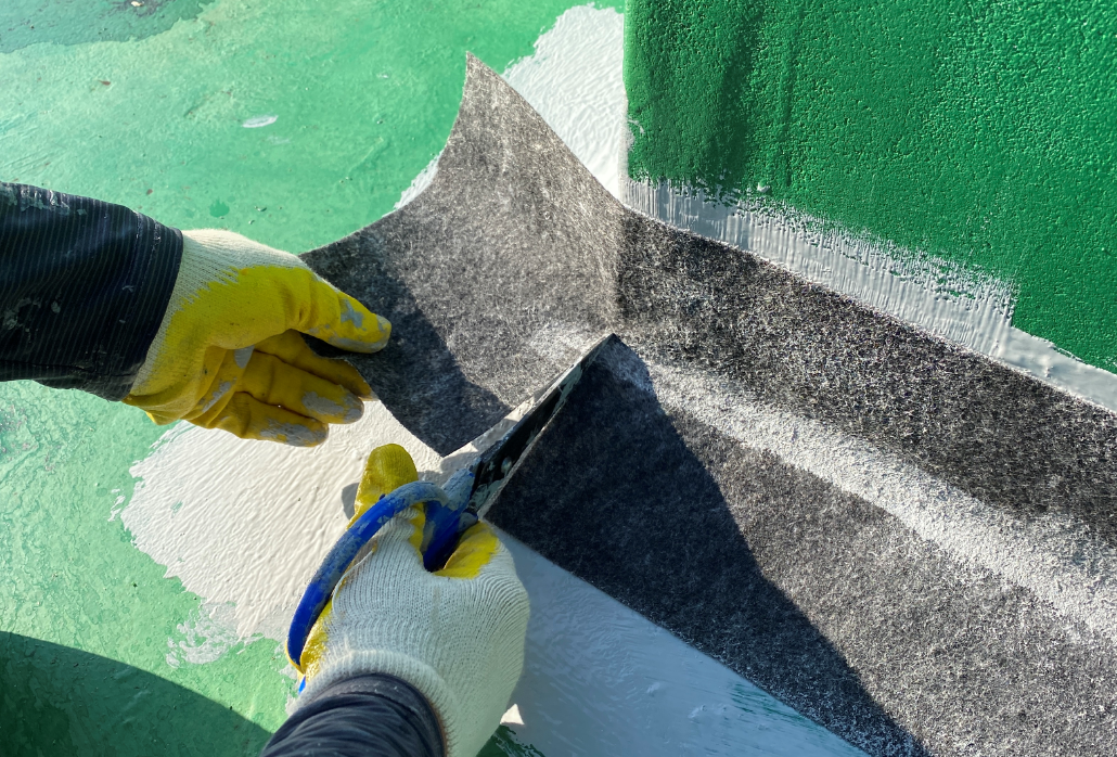 방수 시트를 부착할 때 생기는 틈으로 누수가 발생할 수 있기 때문에 그 틈을 막는 작업이 필요합니다. 방수 시트 밴드를 길게 부착하여 틈을 막습니다. 이 과정을 보강 시트 작업이라고 합니다.