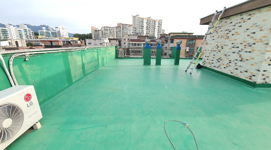 옥상 방수를 시공할 옥상의 모습입니다. 기존에 우레탄으로 칠해져 있으며 하자로 인해 누수가 발생한 상황입니다. 우레탄은 방수력의 유지 기간이 1년에서 2년 정도로 비교적 짧기 때문에 하자가 쉽게 발생합니다.
