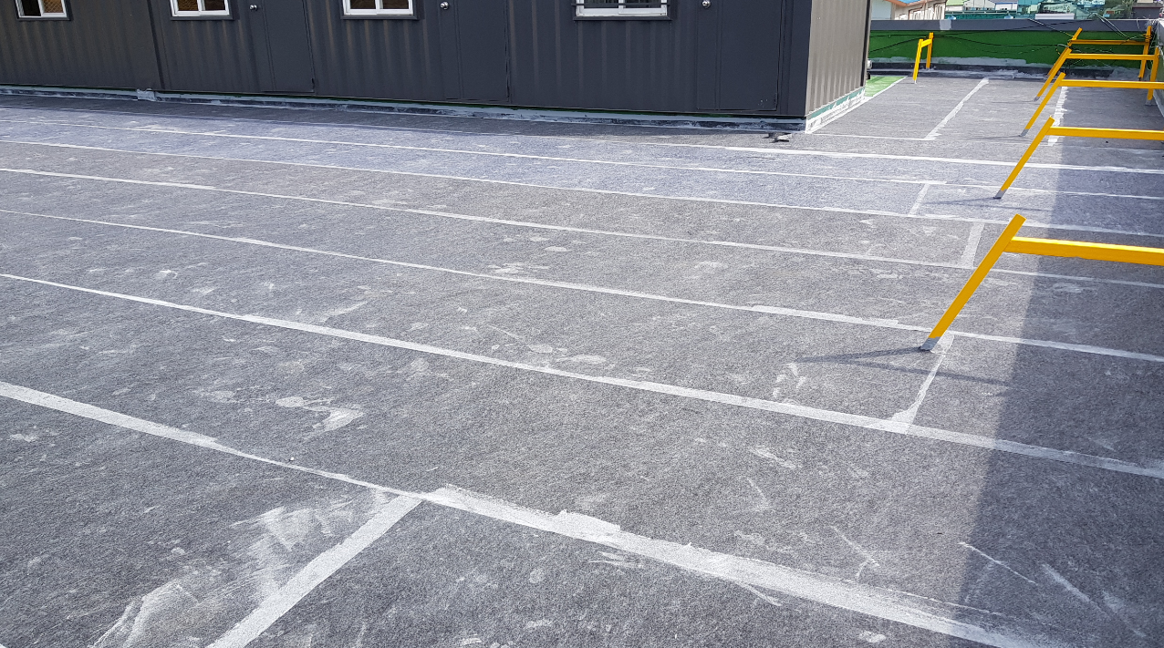 기초 작업 후에는 바닥 시트 작업을 진행합니다. 바닥 전체에 방수 시트를 덮는 작업으로 신축성이 뛰어난 소재를 사용하기 때문에 크랙을 잡는 데에 효과적입니다. 방수액을 먼저 도포한 후 시트를 부착하여 작업합니다.