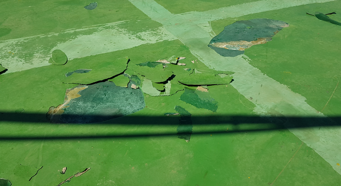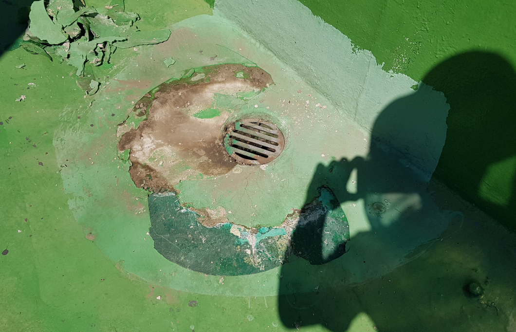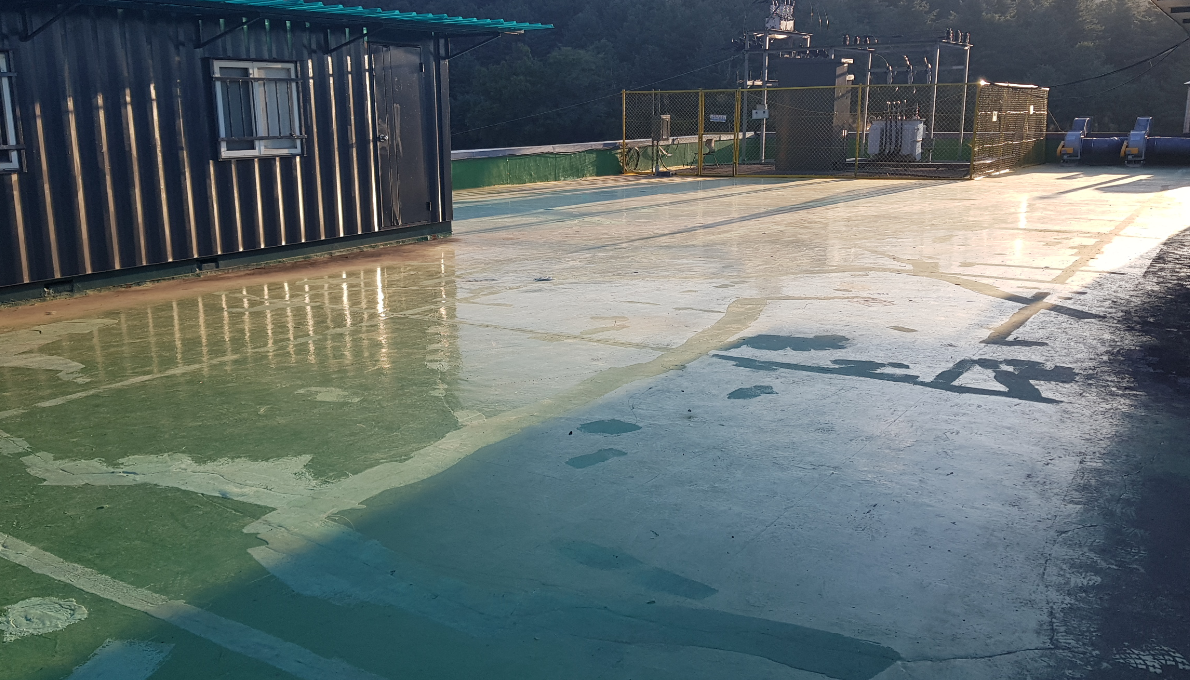 우레탄 방수에서 하자가 생겼기 때문에 방수액과 함께 방수 시트를 사용해 작업하는 복합 시트 방수를 하기로 했습니다. 기존의 옥상 바닥에는 하자가 발생한 부분에 임시로 덧칠해놓은 부분이 많이 보입니다.