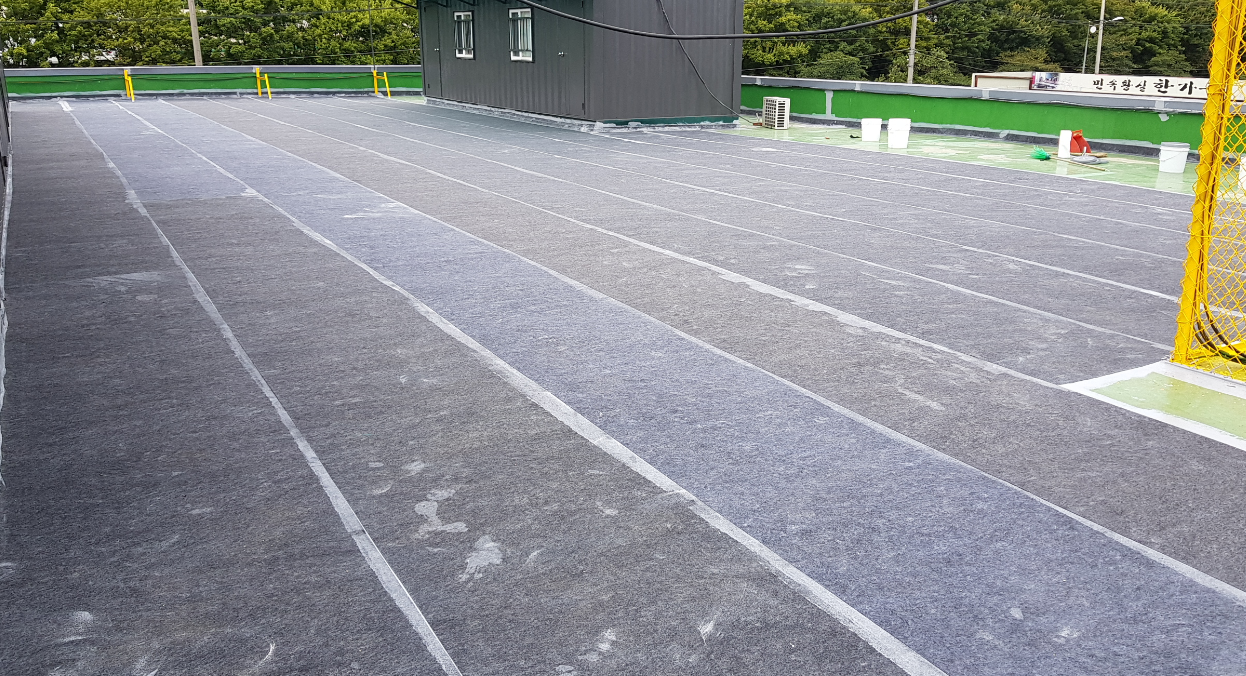 시트 작업 후에는 바닥에서 시트가 떨어지지 않도록 서로 일체화시켜주는 작업이 필요합니다. 이 과정을 함침 작업이라고 하며, 침투 방수액을 방수 시트 위에 전체적으로 도포하여 진행합니다.