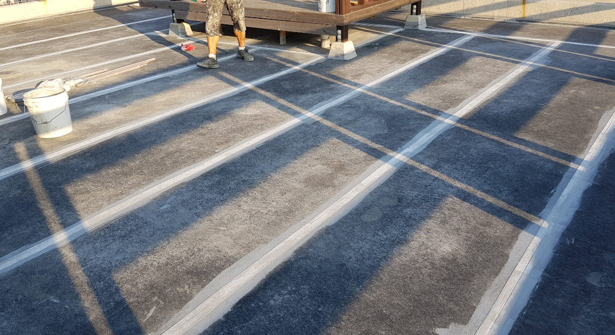다음으로 진행하는 보강 시트 작업은 방수 시트를 부착할 때 생기는 틈으로 누수가 발생하지 않도록 방수 시트 밴드를 길게 붙여서 막는 작업입니다.