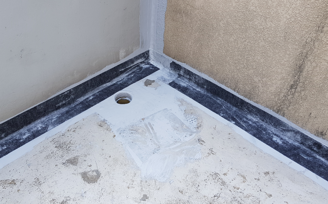다음으로 기초 시트 작업을 시작합니다. 물이 흘러내려가는 우수관이나 벽체와 바닥이 만나는 조인트 부분은 누수에 취약하기 때문에 다른 부분을 작업하기에 앞서 한 번 더 작업해줍니다.