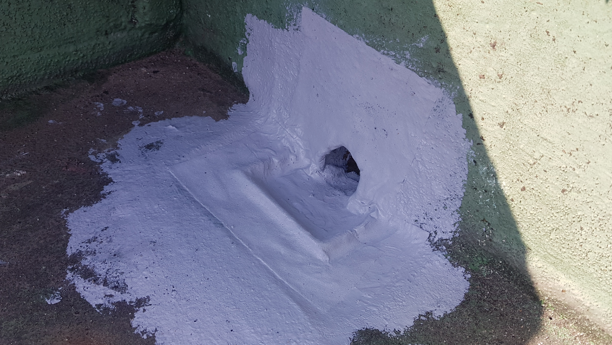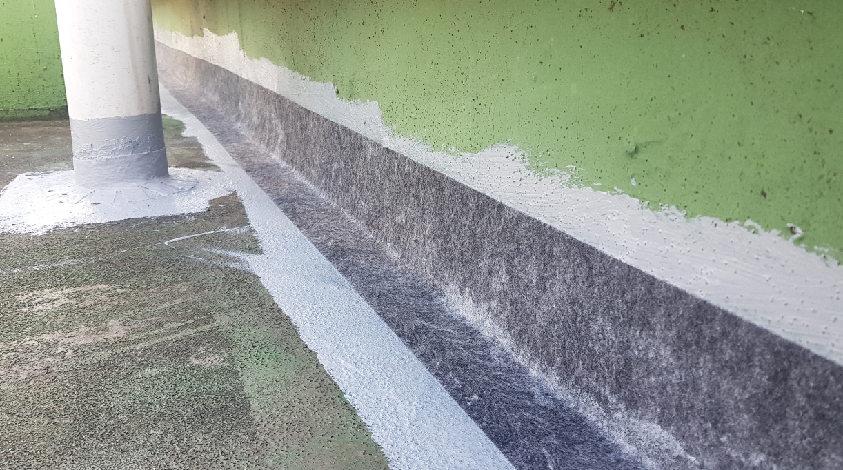 다음은 기초 시트 작업입니다. 누수에 취약한 부분을 보완하기 위한 기초 작업입니다. 물이 흘러내려가는 우수관과 벽체의 조인트 부분 등에 방수제와 방수 시트로 작업합니다.