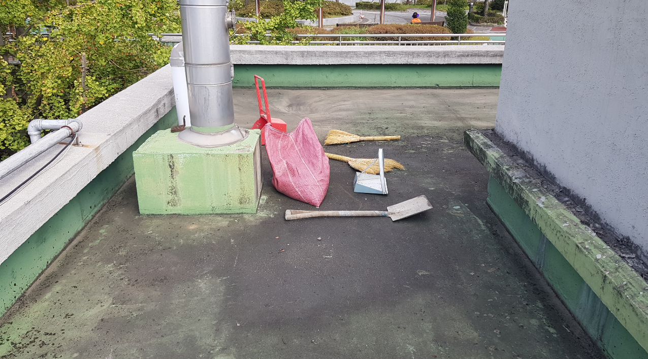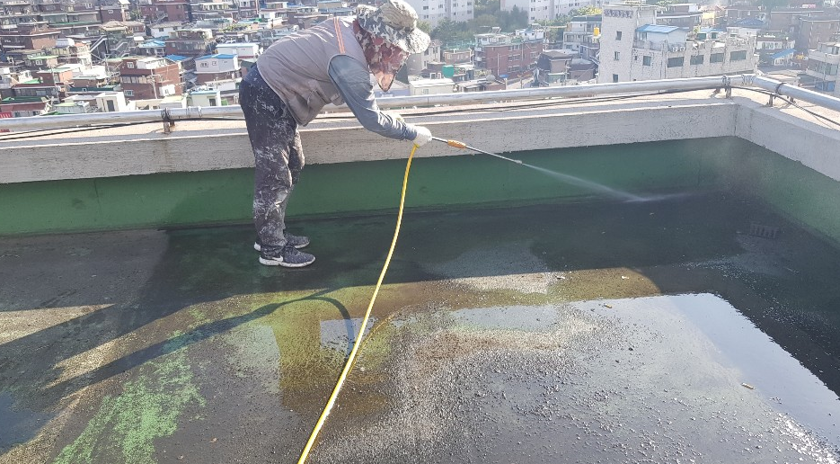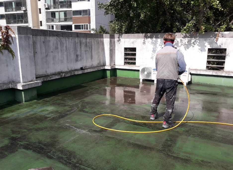 먼저 바닥을 정리합니다. 간단하게 옥상 바닥을 쓸어내 먼지와 이물질을 제거하고, 하자가 있는 부분은 가능한 데까지 들어내서 추후에 하자가 일어날 가능성을 최대한 배제합니다.