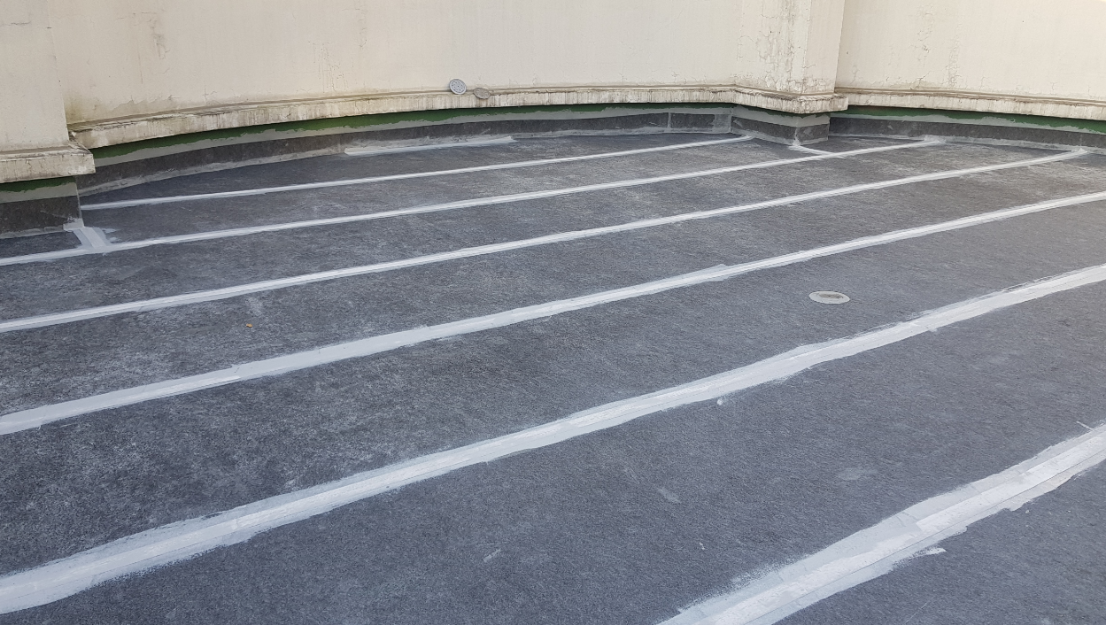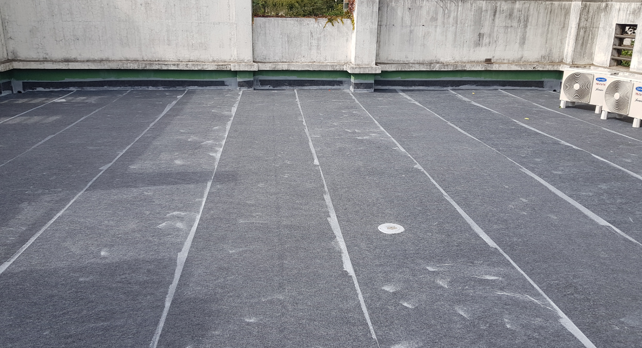 기초 작업 후에는 바닥 전체에 방수 시트를 부착합니다. 옥상 바닥에 먼저 방수제를 칠하고 그 위에 시트를 부착하는 방식을 사용합니다. 작업에 사용하는 시트는 섬유 소재이기 때문에 신축성이 좋습니다. 뛰어난 신축성으로 옥상의 균열을 단단하게 잡아줘 하자의 재발을 막습니다.