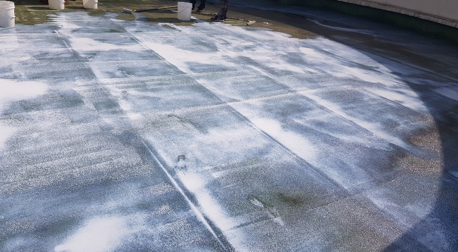 다음으로 함침 작업을 진행합니다. 함침은 방수 시트와 옥상 바닥을 서로 일체화시키기 위해 침투 방수제를 도포하는 작업입니다. 시트가 바닥에서 들떠 빈 공간이 생기면 그 틈으로 누수가 생길 수 있기 때문에 진행하는 작업 과정입니다.