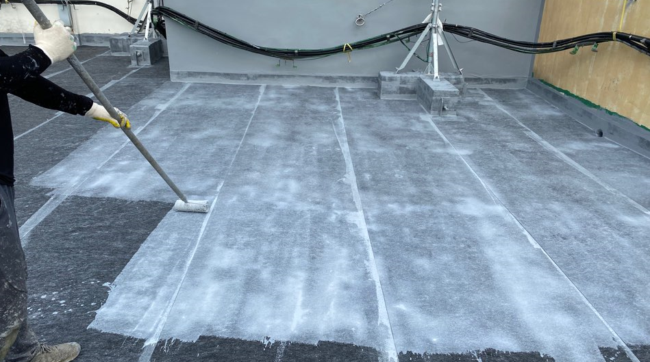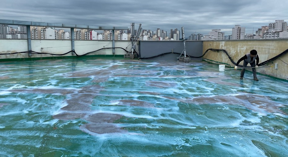 바닥에 미세하게 남은 먼지와 이물질을 제거하고 침투 방수의 효과를 위해 프라이머 작업을 진행합니다. 프라이머는 침투 방수액을 옥상 전체에 도포하는 작업입니다.