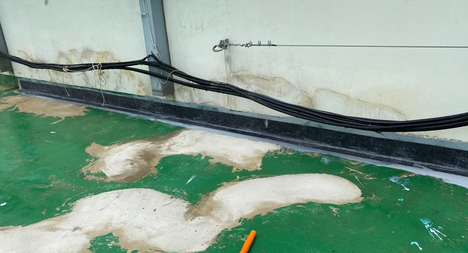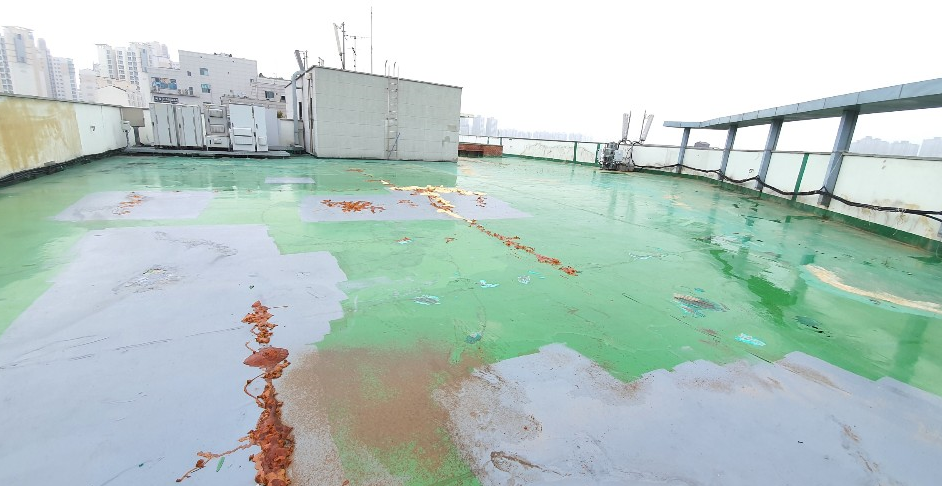 우레탄으로 시공한 옥상의 모습입니다. 누수가 발생하여 임시방편으로 여러 방법을 시도한 흔적이 많이 보입니다. 그럼에도 누수를 잡지 못해 이번에 복합시트방수를 진행하게 됐습니다.
