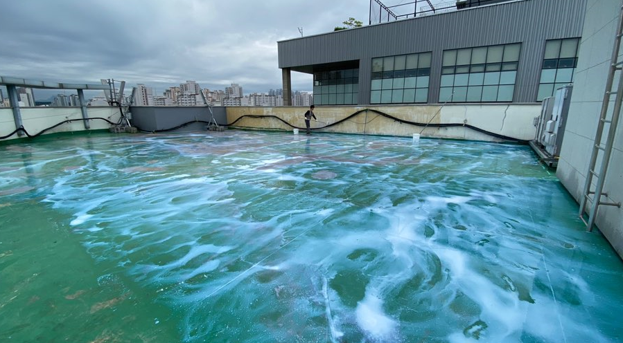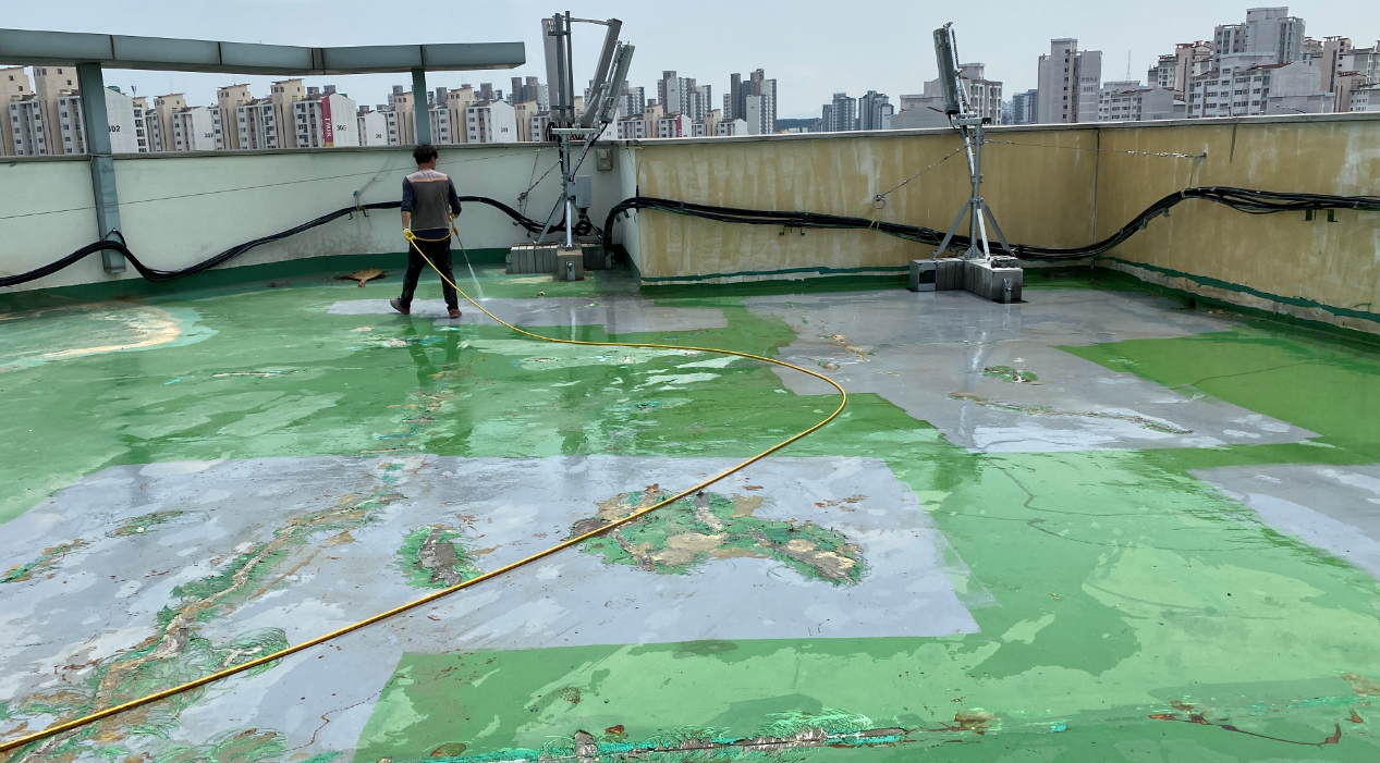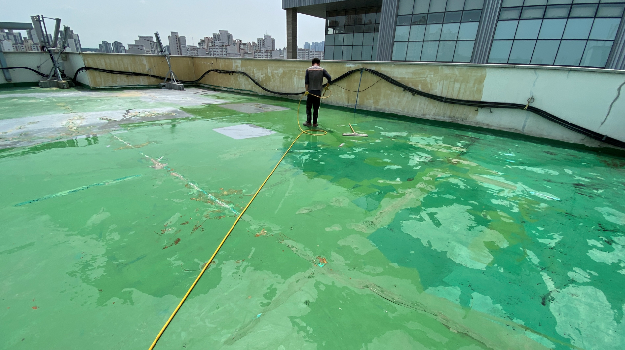 바닥 정리 후에는 물청소를 합니다. 옥상의 먼지와 이물질을 제거하기 위해 고압 세척기를 사용합니다. 고압력으로 물청소를 하기 때문에 먼지와 이물질은 물론 묵은 때까지 깔끔하게 청소할 수 있습니다.