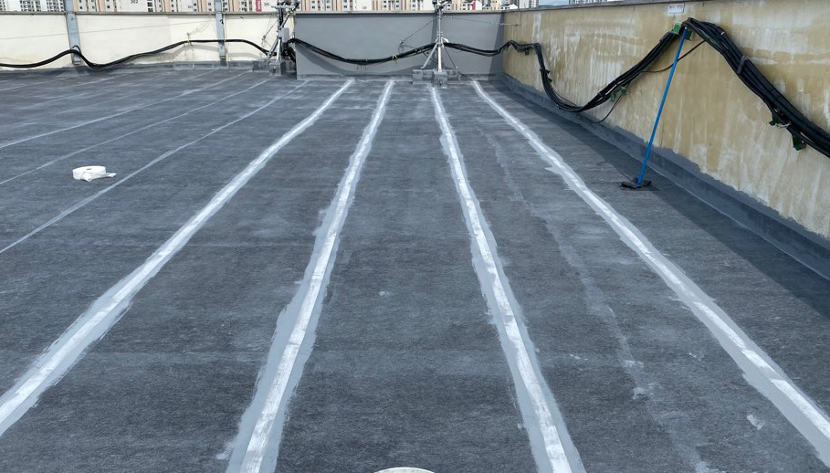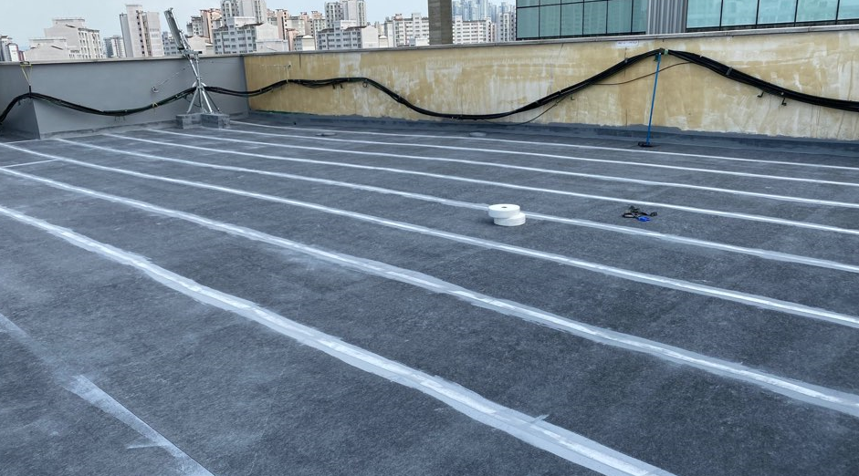 기초 작업 후에는 본격적으로 옥상 전체를 방수시트로 덮어줍니다. 방수액을 도포한 후 시트를 부착합니다. 작업에 사용하는 방수시트는 크랙을 잘 잡아줄 수 있도록 신축성이 좋은 섬유 소재를 사용합니다. 눈에 보이지 않는 건물의 수축과 팽창에 잘 견뎌 건물과 함께 호흡하기 때문에 다시 갈라지는 일 없이 튼튼합니다.