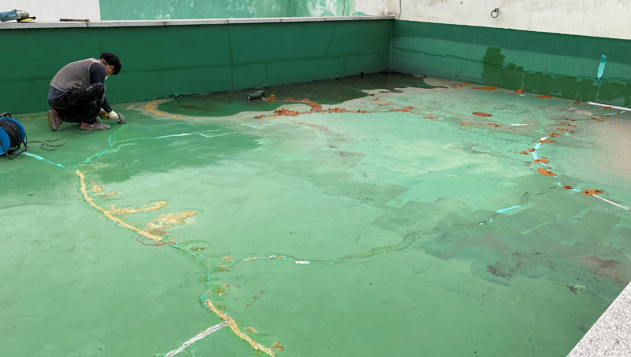 먼저 불필요하게 튀어나와 작업에 방해가 되는 부분을 제거하는 바닥 정리 작업을 합니다. 칼과 그라인더 등으로 방해 요소를 제거하고 하자가 있는 부분도 가능한 한 들어내 제거합니다. 하자가 있는 부분을 그대로 둔 채로 그 위에 방수공사를 하면 다시 누수가 발생하기 때문입니다.