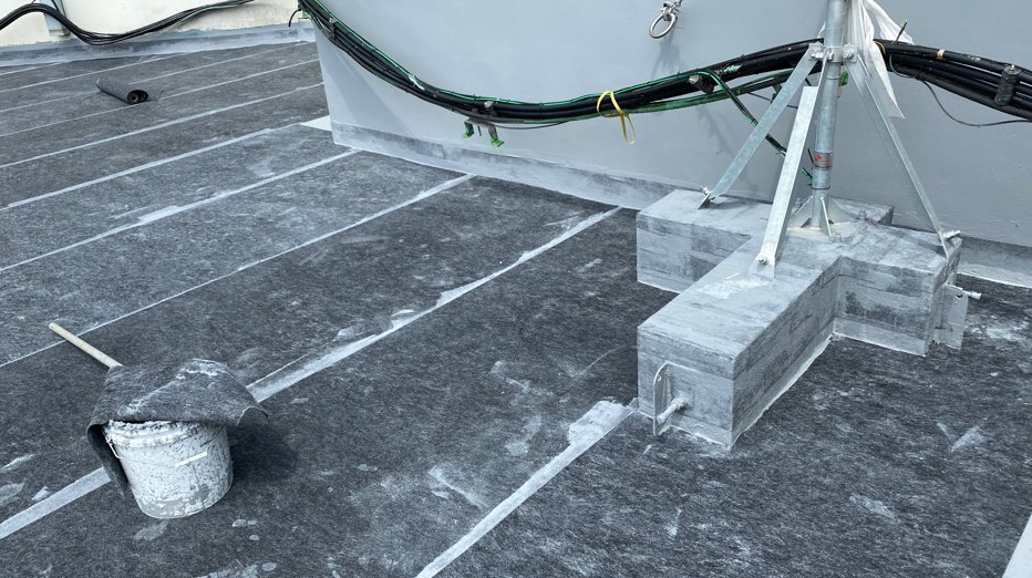 옥상에는 다른 부분보다 특히나 누수에 취약한 부분이 몇 군데 존재합니다. 물이 흘러내려가는 우수관이나 벽체의 조인트 부분이 대표적으로 이러한 취약점을 보완하기 위해 방수액과 방수시트로 보강하는 기초 시트 작업을 진행합니다.