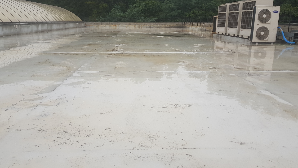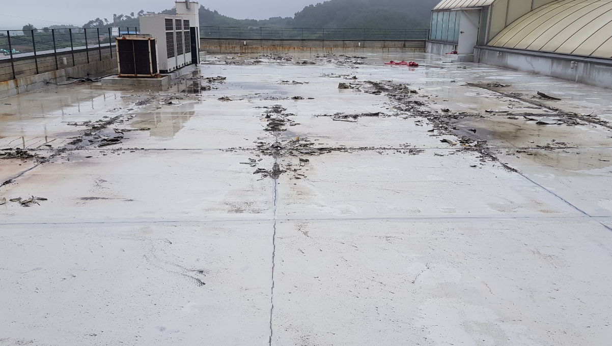 방수공사를 시공하기 전 옥상의 모습입니다. 비가 온 상태로 계속해서 물이 새고 있었습니다. 먼저 시공 전 원활한 작업을 위해 바닥을 정리하는 작업을 할 예정입니다.