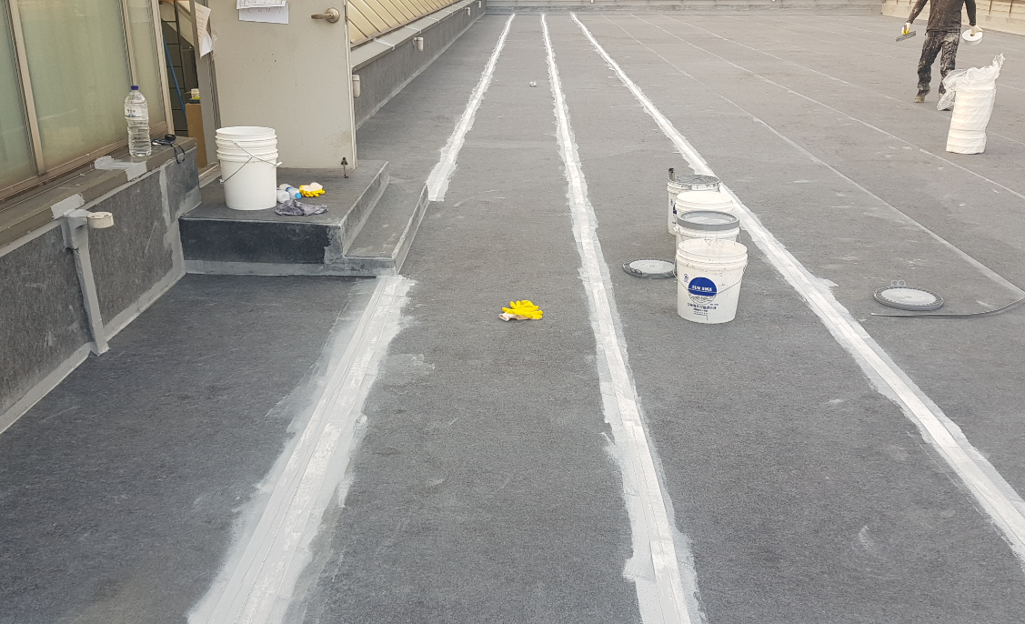 옥상에는 특히 누수가 잘 발생하는 부분이 있습니다. 바로 우수관과 벽체의 조인트 부분이 이에 해당합니다. 이렇게 누수에 취약한 부분에는 방수액과 방수시트로 다른 곳보다 한 차례 더 보강하는 작업이 필요합니다. 이 과정을 기초 시트 작업이라고 합니다.
