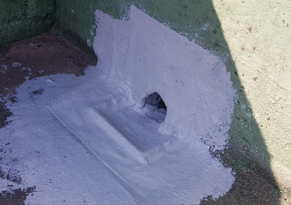 물이 흘러내려가는 우수관이나 벽체와 바닥이 만나는 조인트 부분은 누수에 취약한 부분입니다. 이렇게 누수에 취약한 부분에는 방수액과 방수시트로 미리 한 번 시트 작업을 해서 보강해줍니다. 이 과정을 기초 시트 작업이라고 합니다.