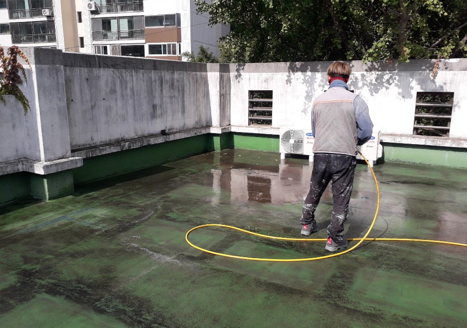 다음은 물청소 작업입니다. 고압 세척기를 사용해 청소하기 때문에 먼지와 이물질을 깨끗하게 제거할 수 있습니다. 여기까지가 본격적인 작업 전 작업 환경을 만들기 위한 과정입니다.