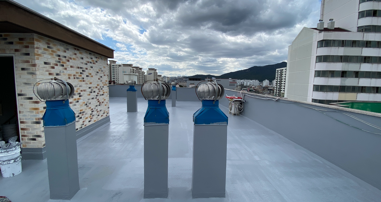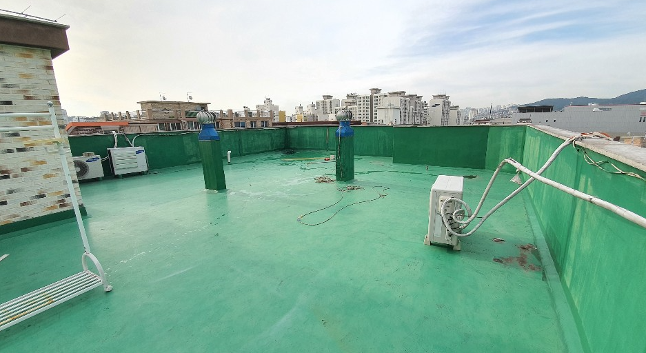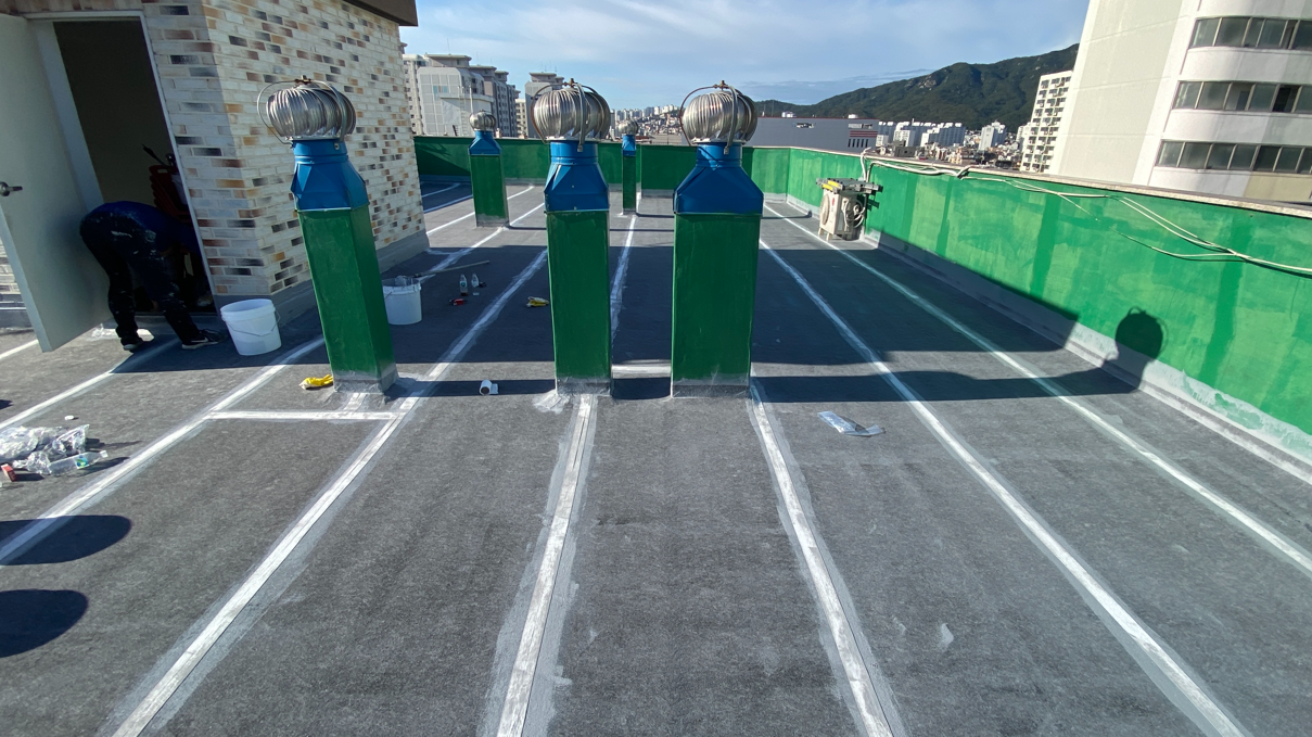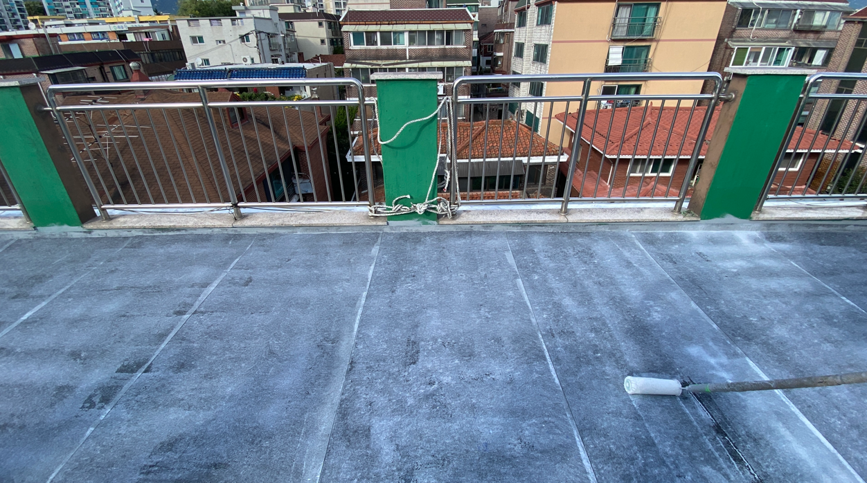 방수공사의 마지막 작업은 상도입니다. 상도는 자외선을 차단하여 방수층을 보호하는 역할을 하기 때문에 방수력이 오랫동안 보존됩니다. 이로써 복합시트 방수로 작업한 방수공사의 모든 과정이 마무리됐습니다. 하자 보증 기간은 6년이며 계속해서 고쳐쓸 수 있는 옥상이 완성됐습니다.