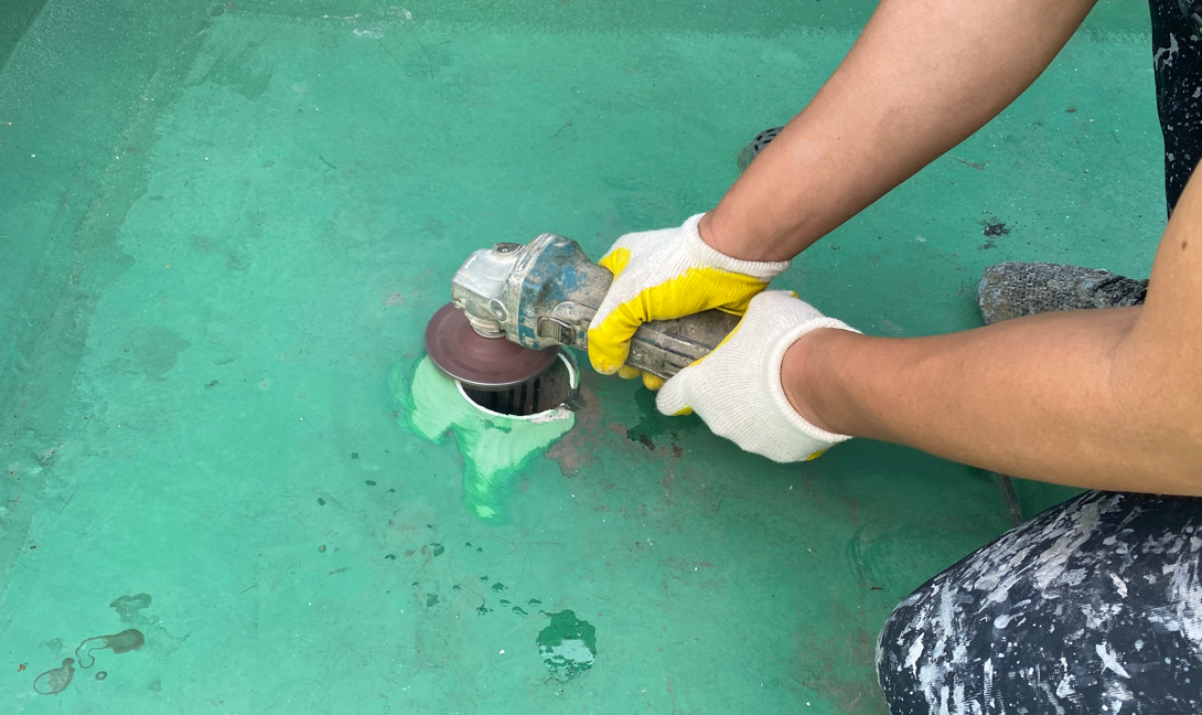 복합시트 방수의 시공에 앞서 바닥을 정리합니다. 작업에 방해가 되거나 불필요한 부분을 칼과 그라인더 등으로 제거하고 바닥이 들뜬 부분은 최대한 들어냅니다. 바닥 정리 후에는 물청소를 해서 바닥의 먼지와 이물질 등을 깔끔하게 제거합니다.