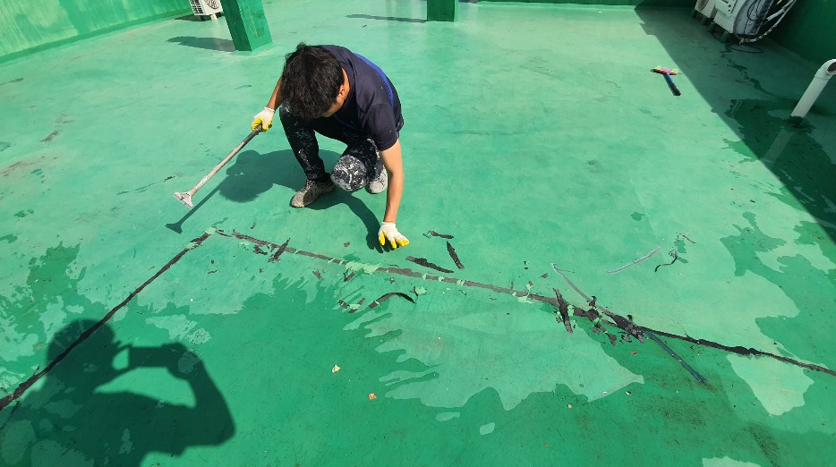 기존에 우레탄으로 시공한 옥상입니다. 우레탄은 시공이 편하고 비용이 상대적으로 저렴하지만 옥상의 크랙을 잡아주지는 못하기 때문에 내구성이 약합니다. 그만큼 하자가 자주 발생하기 때문에 보수하는데 애를 먹게 됩니다.