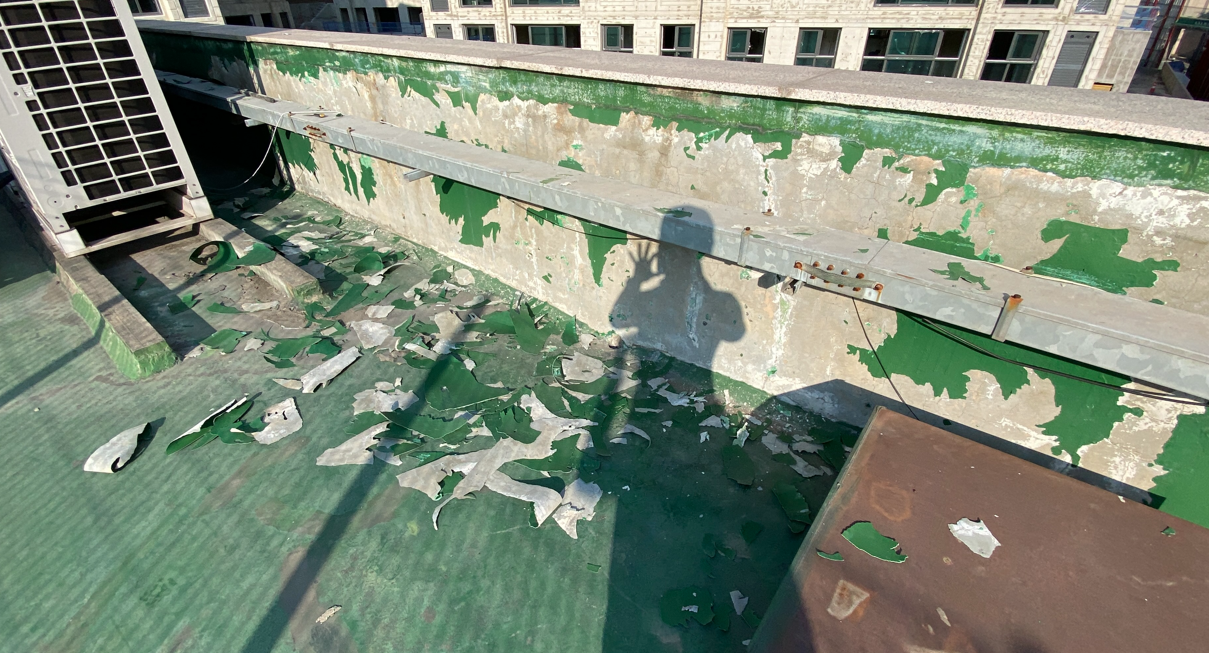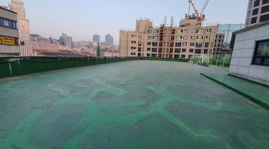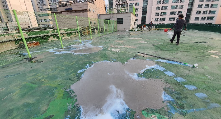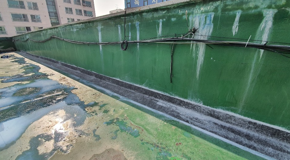 기존에 우레탄으로 작업한 옥상의 모습입니다. 하자가 발생할 때마다 임시방편으로 덧칠을 한 모습입니다. 하지만 얼마 못 가서 다시 터지기 때문에 근본적인 해결법이 필요합니다.