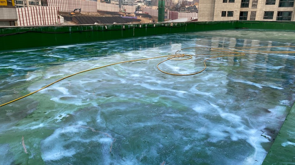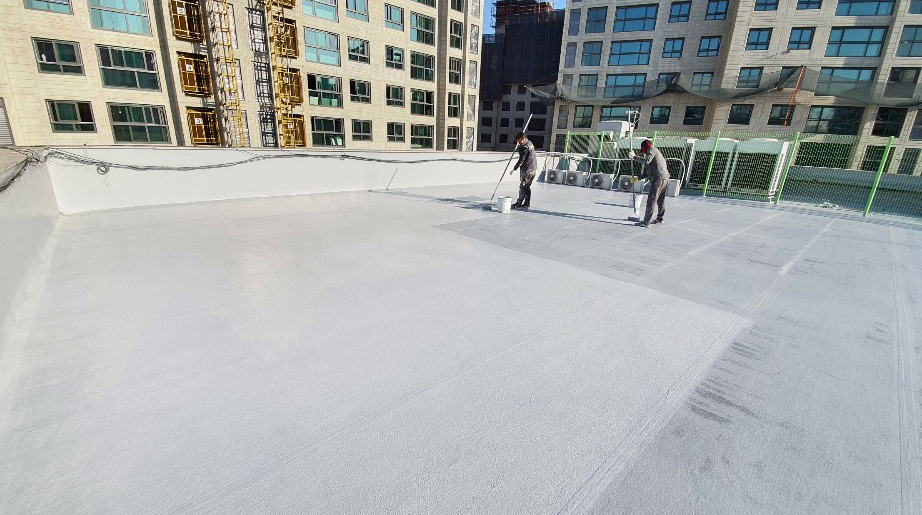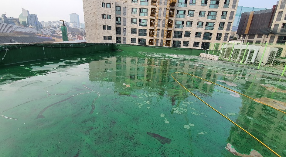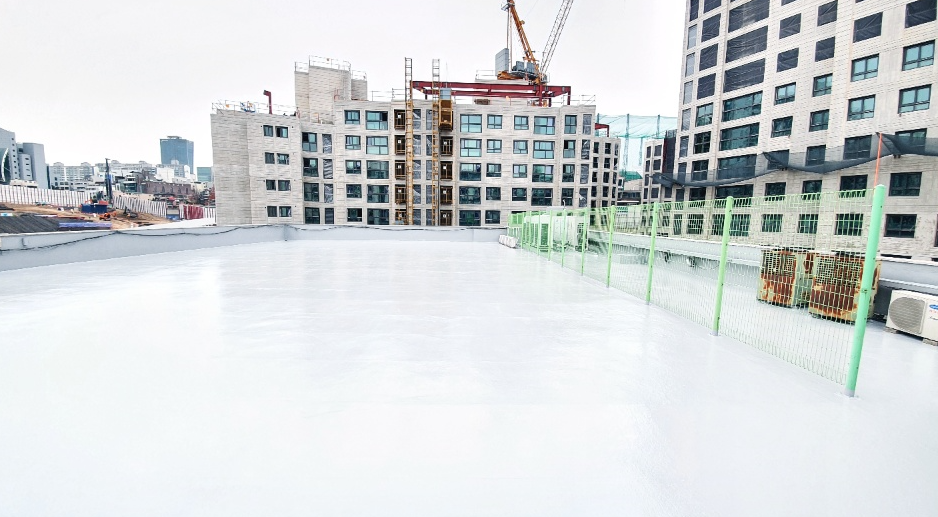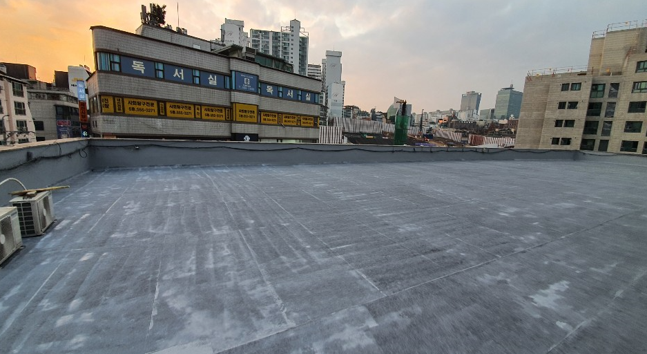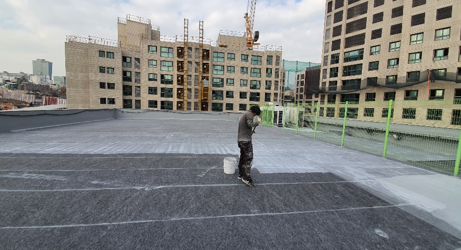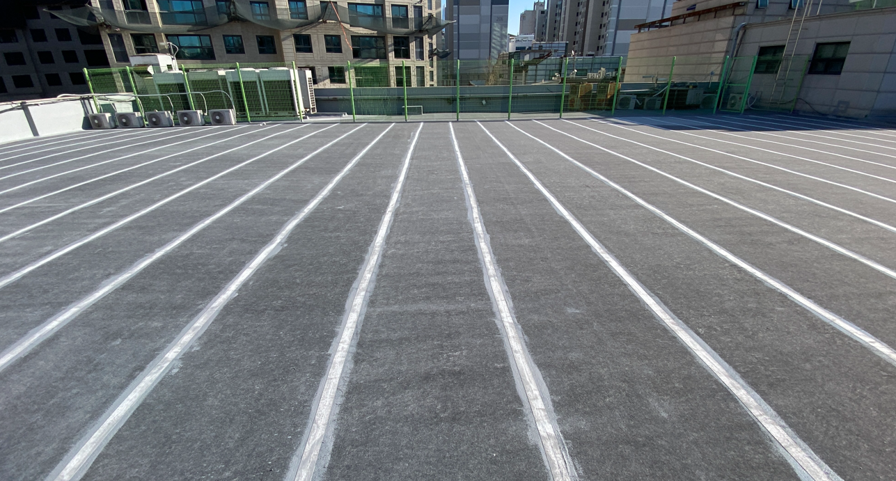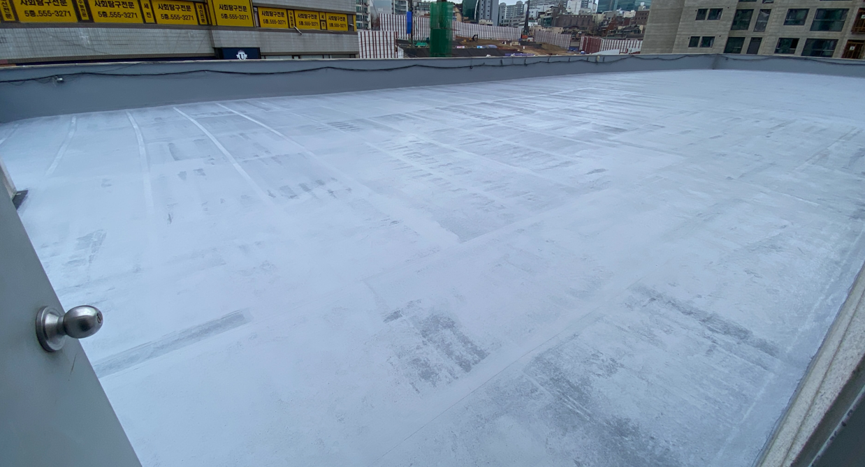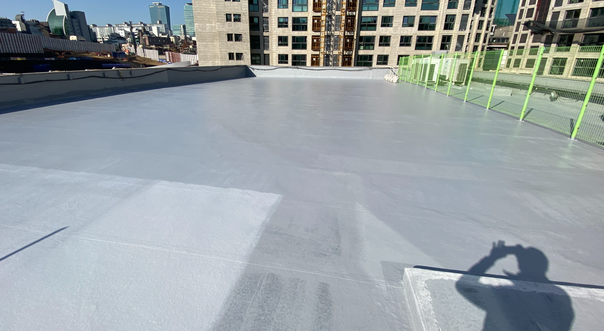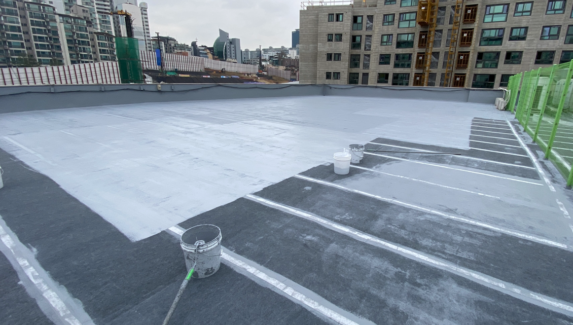 마지막으로 자외선을 차단하여 방수액을 보호하기 위해 상도 작업을 합니다. 상도를 마지막으로 우레탄 방수의 단점을 보완하기 위해 작업한 복합시트 방수의 모든 과정이 마무리됩니다.