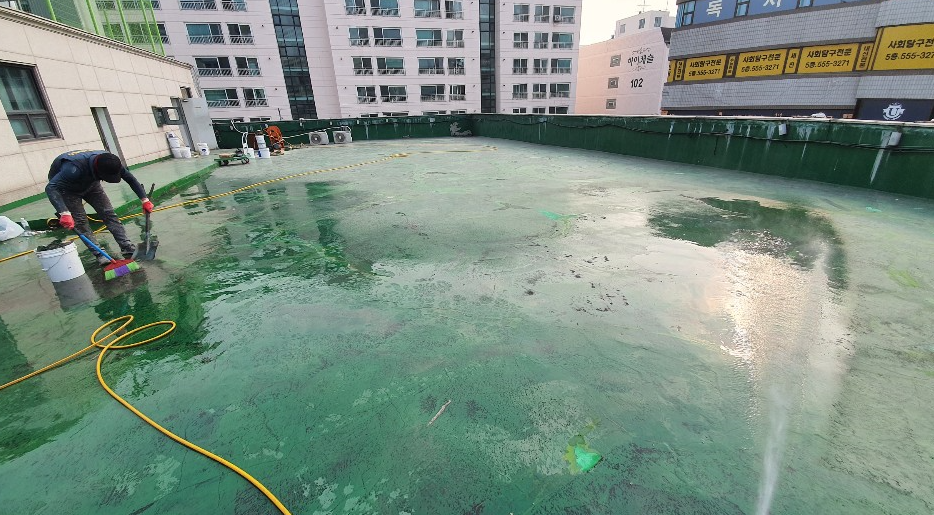 다음은 고압 세척기로 물청소를 합니다. 장시간 쌓인 먼지와 이물질 등을 깔끔하게 제거하기 위한 작업으로 원활한 시공을 위해 필요한 과정입니다.