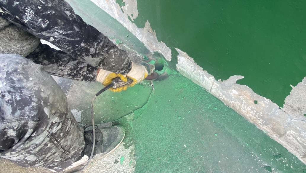 바닥이 파여 작업이 곤란한 부분은 미장 작업을 합니다. 미장은 몰탈과 침투 방수액을 일정한 비율로 혼합한 것으로 작업합니다.