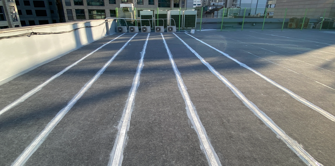 방수시트를 부착할 때 서로 겹쳐서 작업하기 때문에 이때 생기는 틈으로 누수가 일어날 수 있습니다. 이 틈을 막기 위해 방수시트 밴드를 길게 부착합니다. 이 과정을 보강 시트 작업이라고 부릅니다.