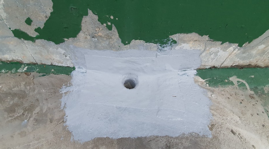 시트를 부착한 후에는 바닥에서 떨어지지 않도록 고정하는 작업이 필요합니다. 침투 방수액을 시트 위에 도포하여 바닥과 서로 일체화를 시킵니다. 이 과정을 함침 작업이라고 합니다.