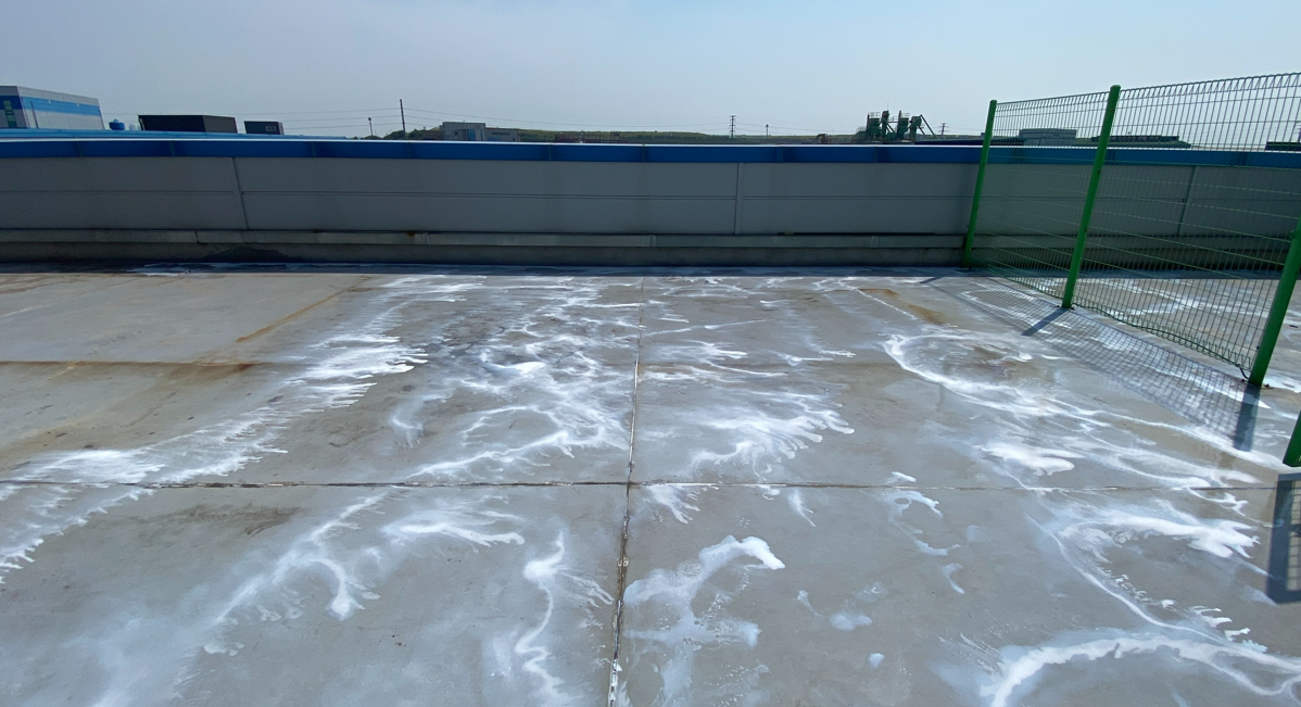 다음은 함침 작업입니다. 함침은 방수시트와 바닥이 서로 떨어지지 않도록 일체화시키는 과정으로 침투 방수액을 시트 위에 전체적으로 도포하는 작업입니다.